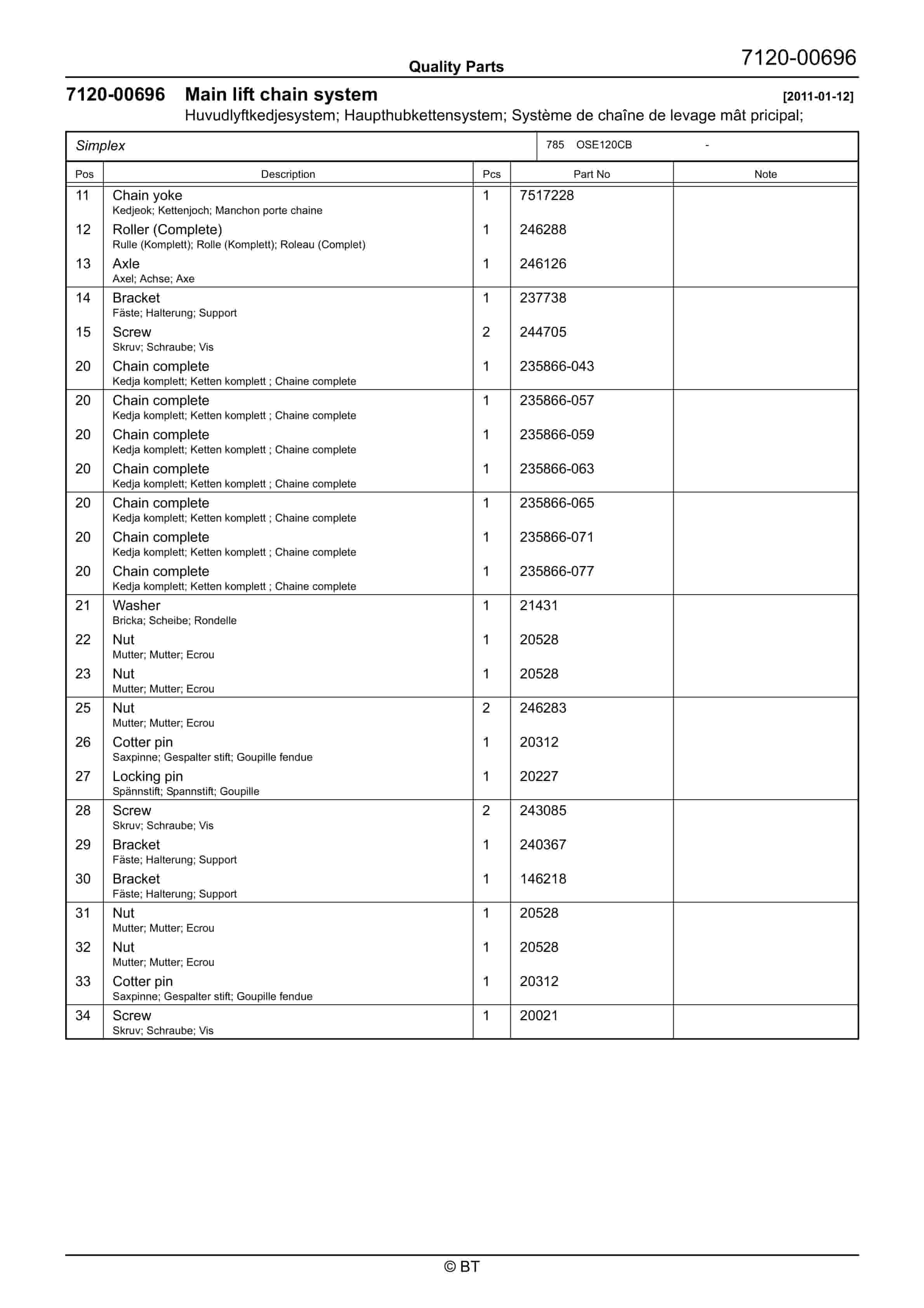 BT 602-TT, 608-TT, 609-TT, 610-TT, 612-TT, 620-TT (AC) Quality Parts 253711