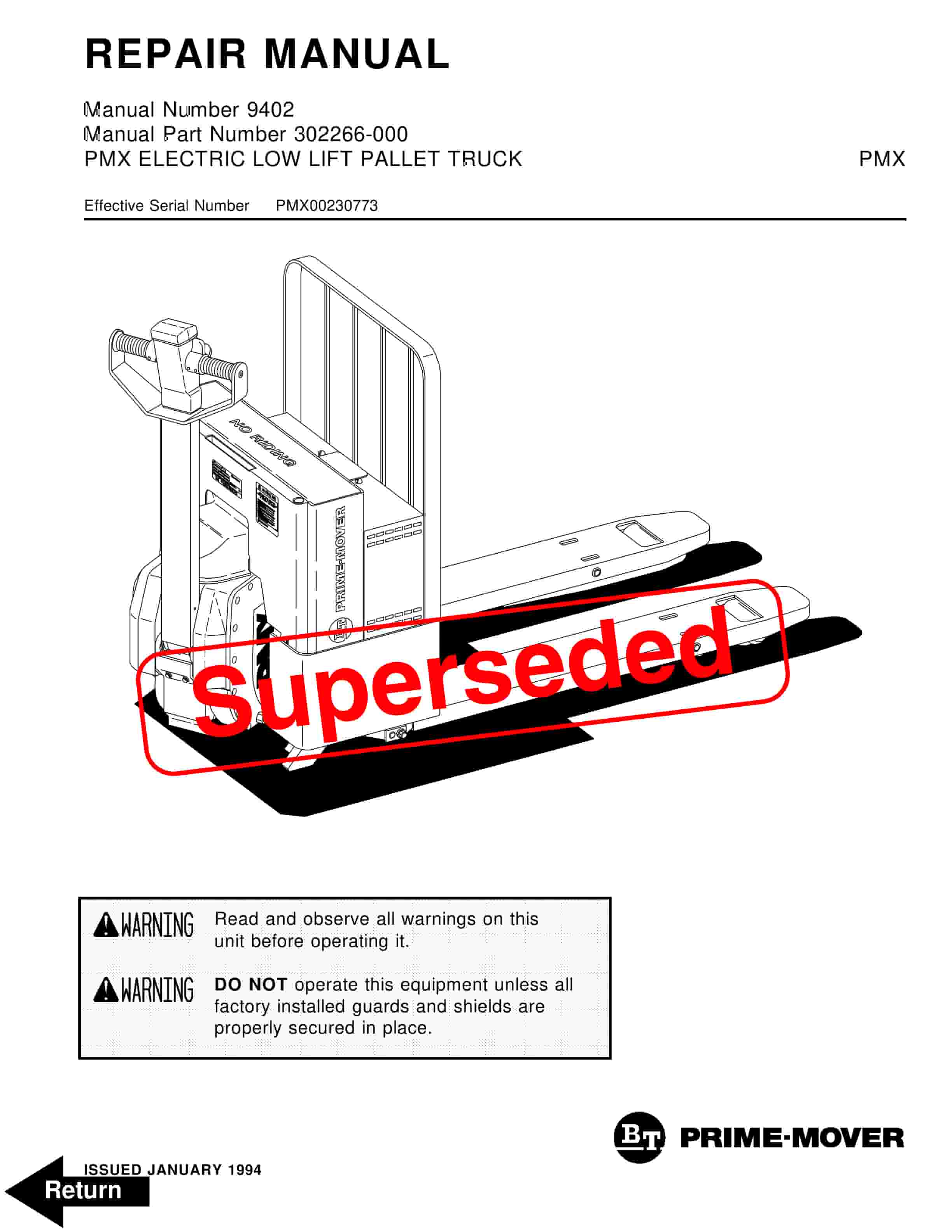 BT PMX Electric Low Lift Pallet Truck Repair Manual 9402 302266-000