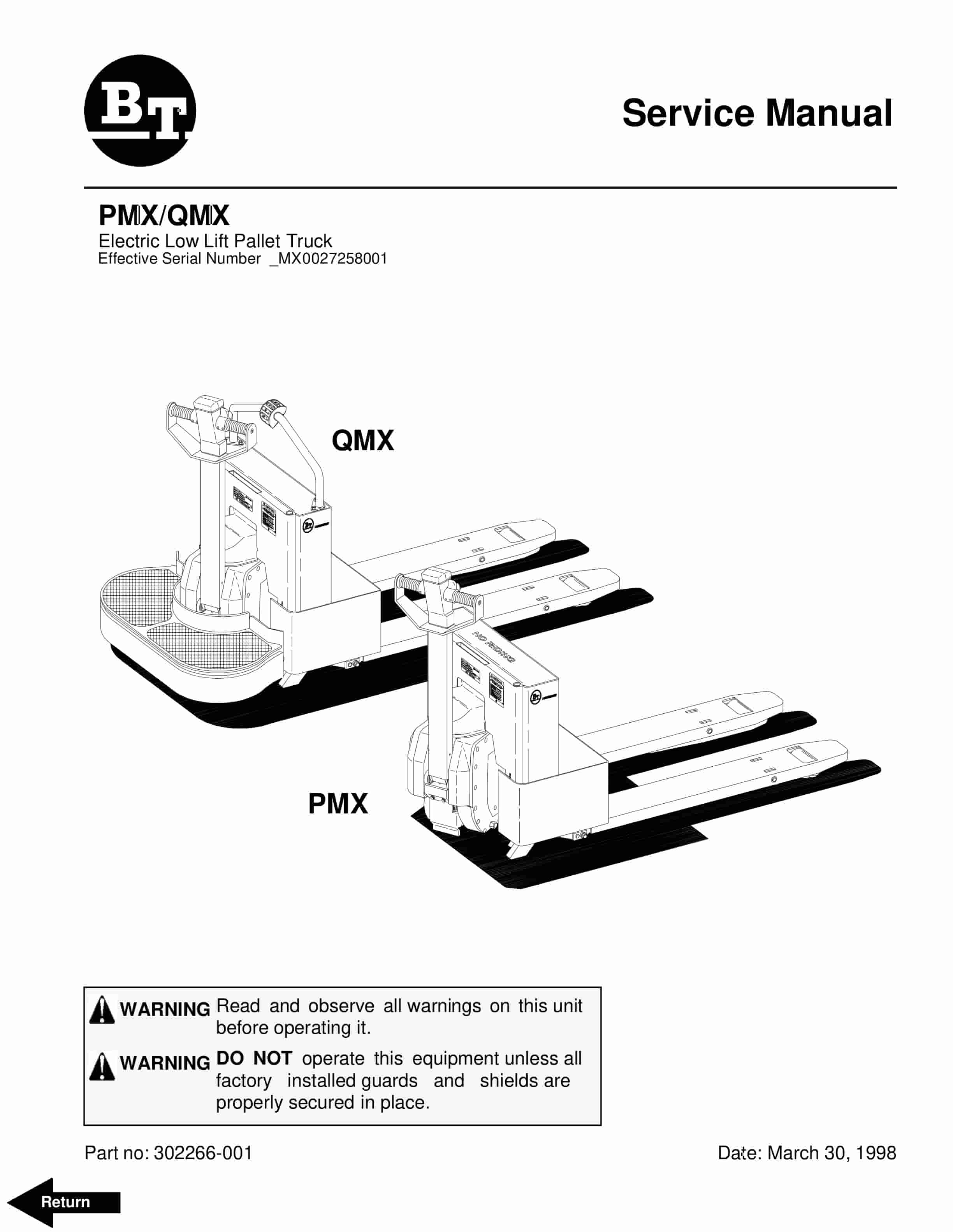 BT PMX, QMX Electric Low Lift Pallet Truck Service Manual 302266-001
