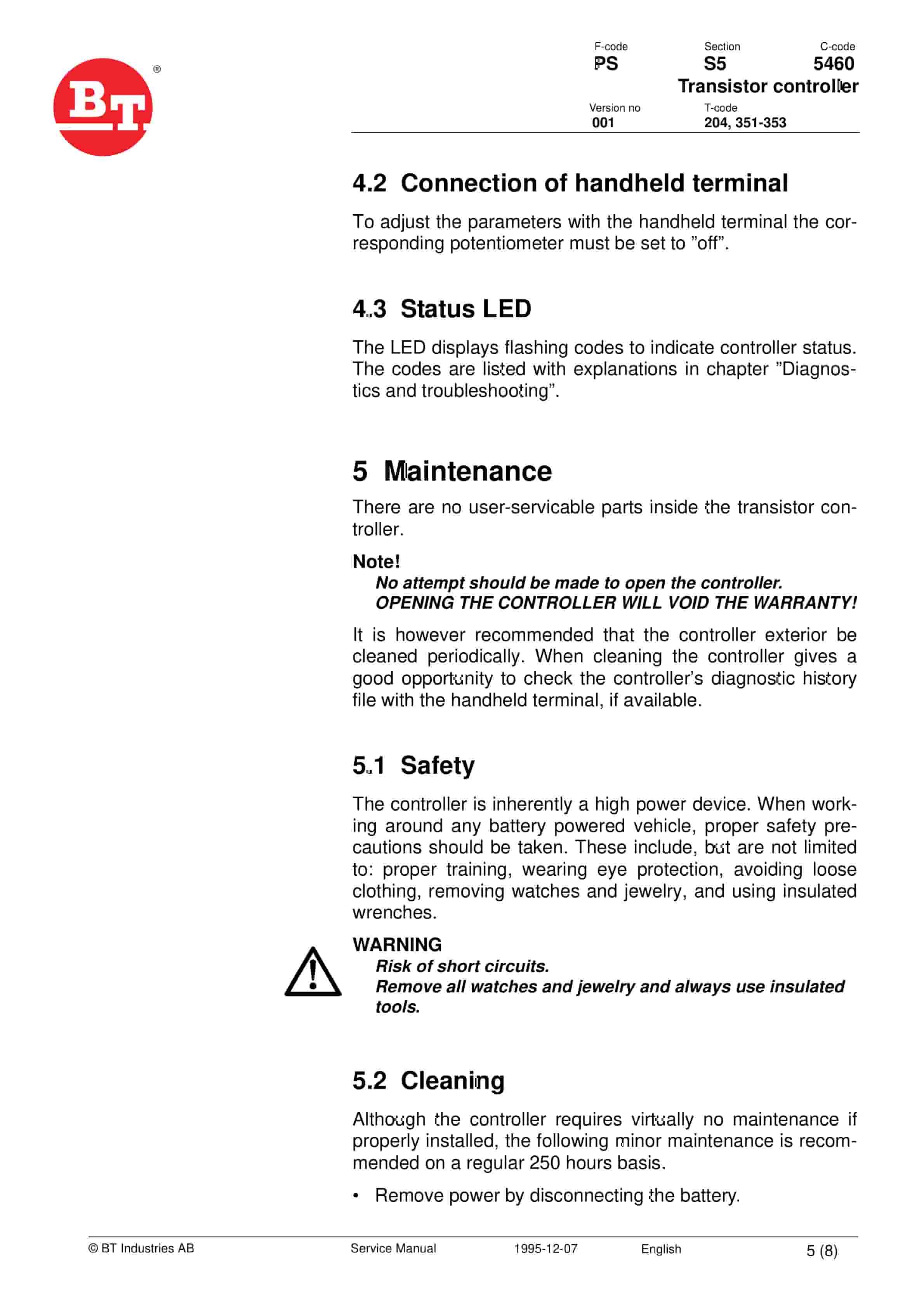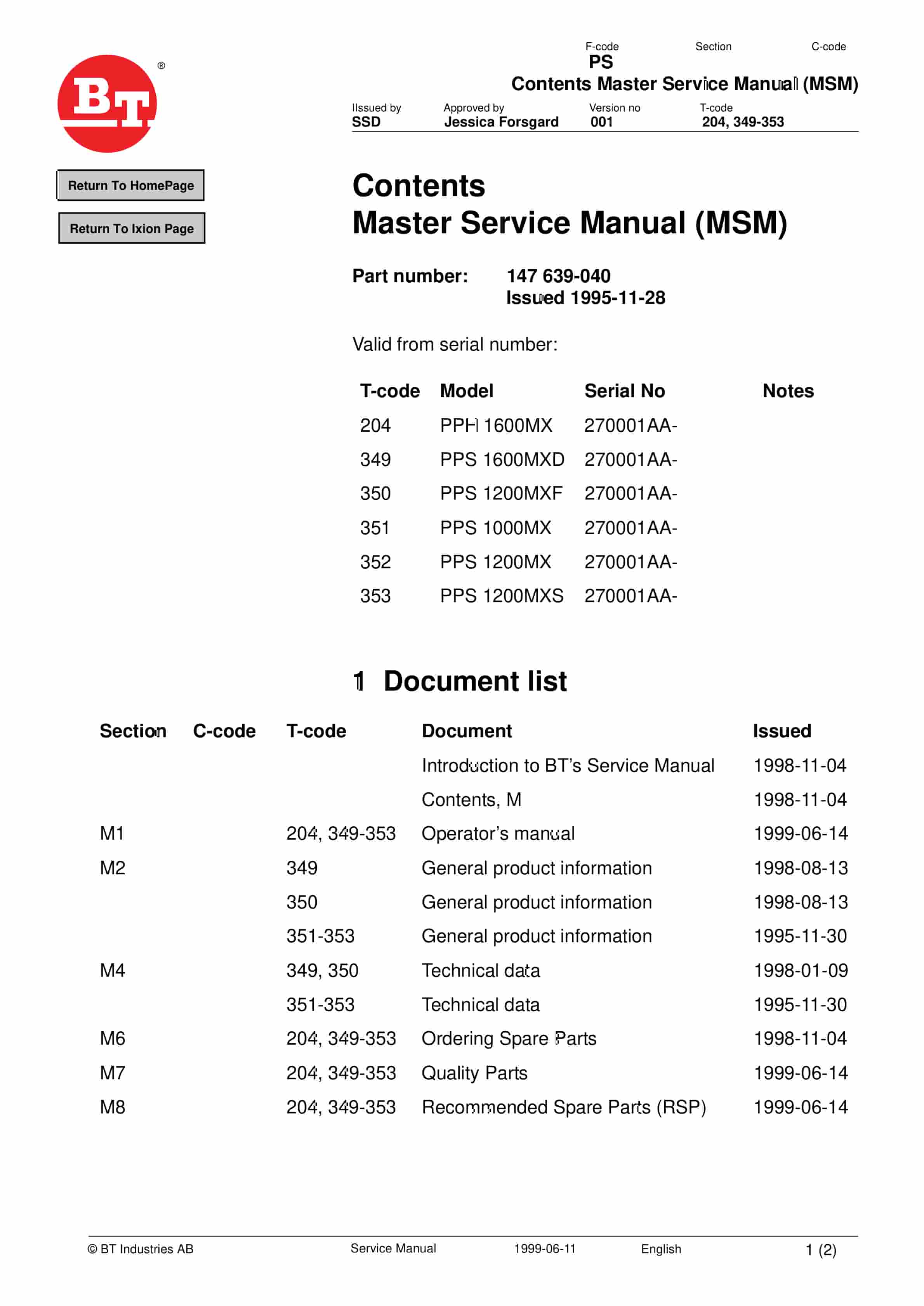 BT PPH1600, PPS1600, PPS1200, PPS1000 Service Manual 147639-040