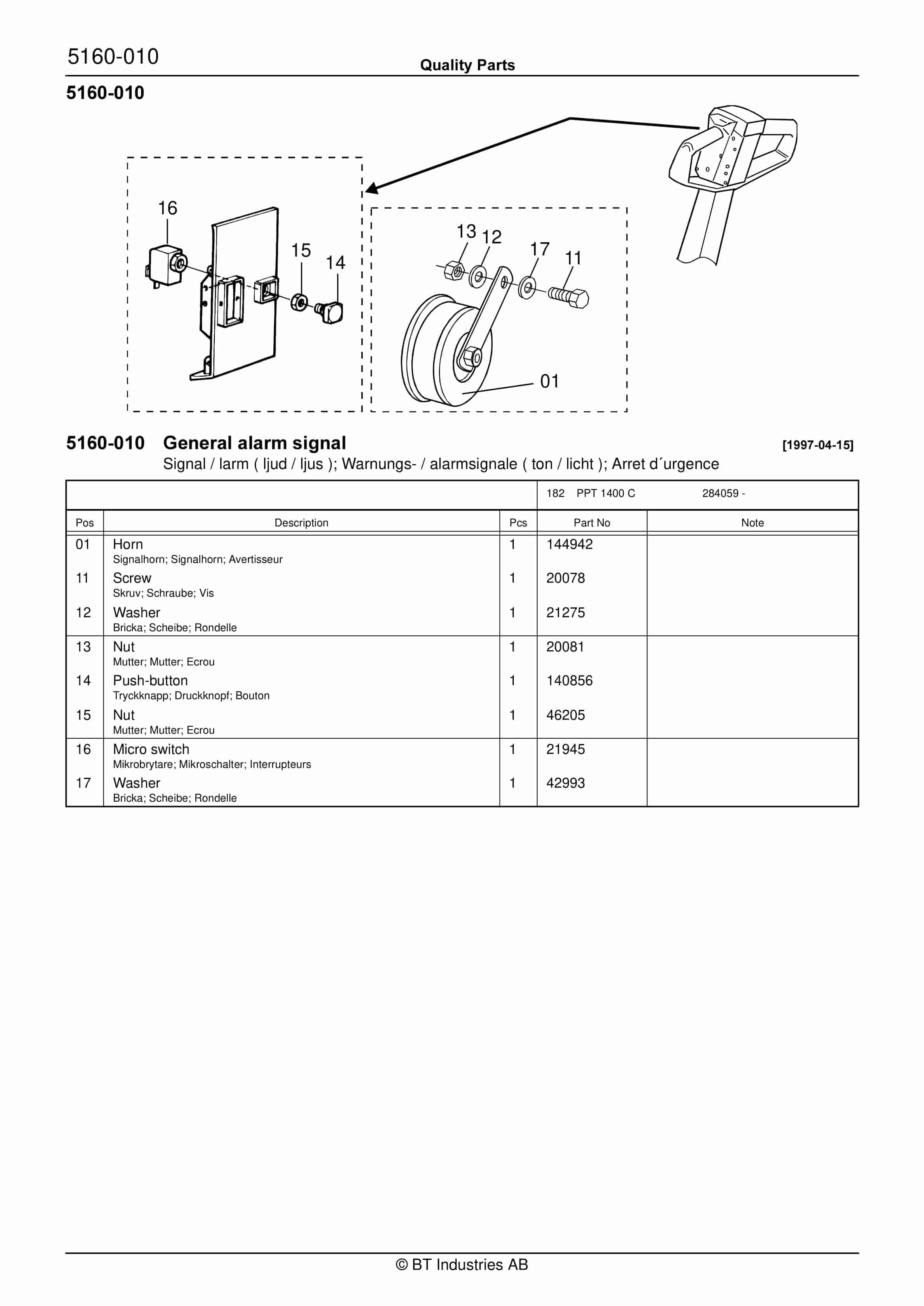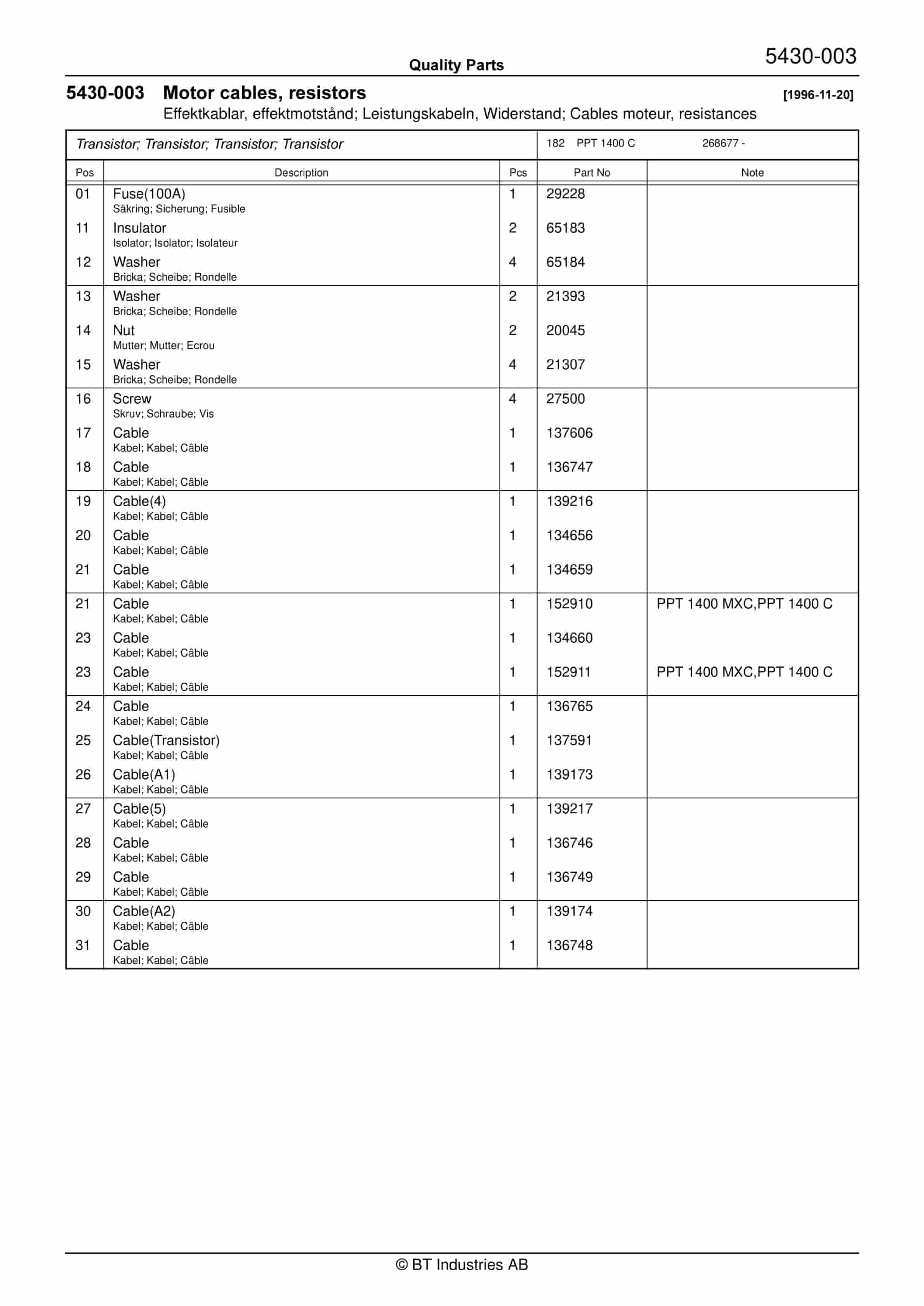 BT BTL20EW, BTL20EWO, BTL30EW, BTL30EWO, L20BR, L20BRO, L30BR, L30BRO Quality Parts 177967