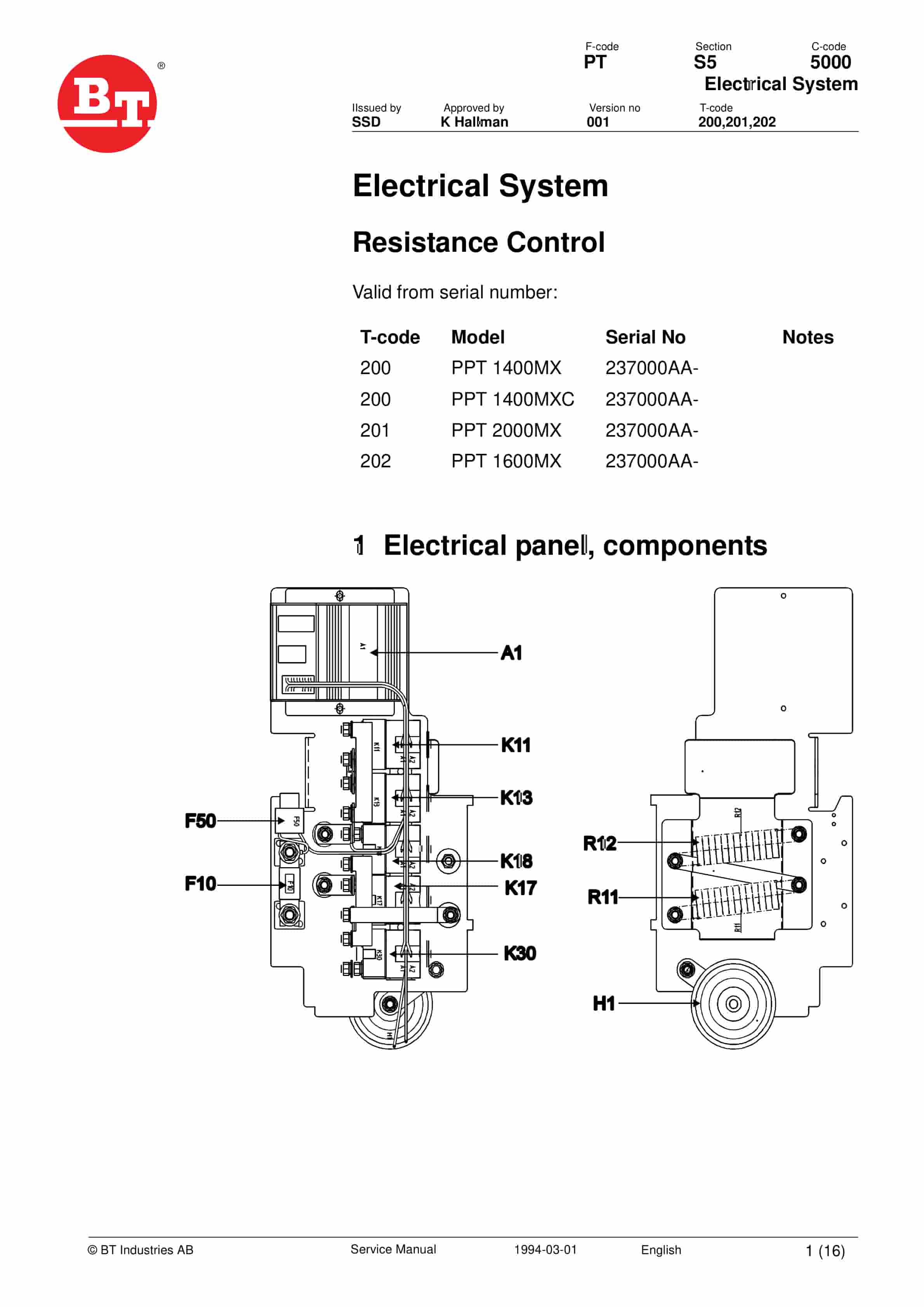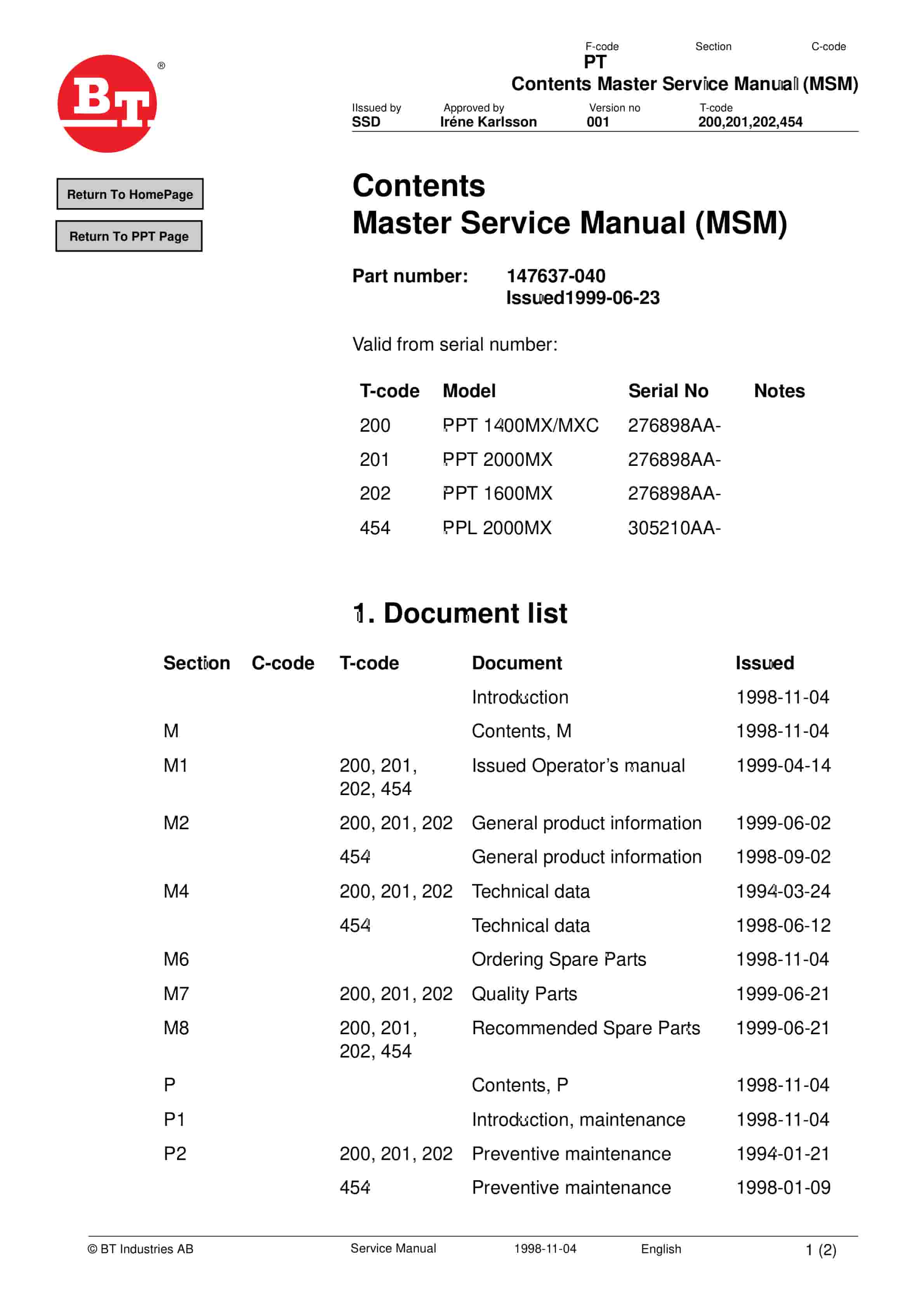 BT PPT1400, PPT1600, PPT2000, PPL2000 Service Manual 147637-040