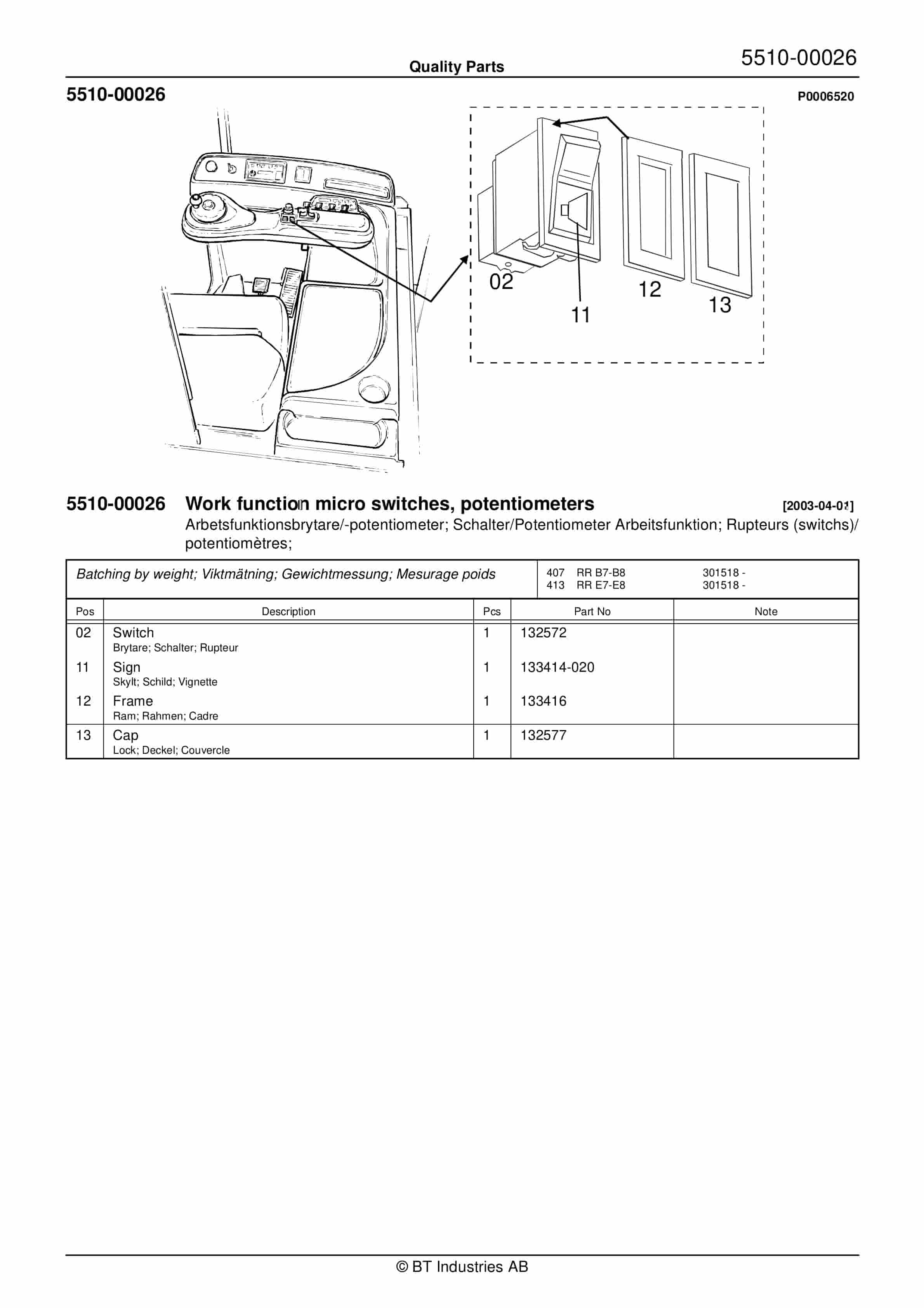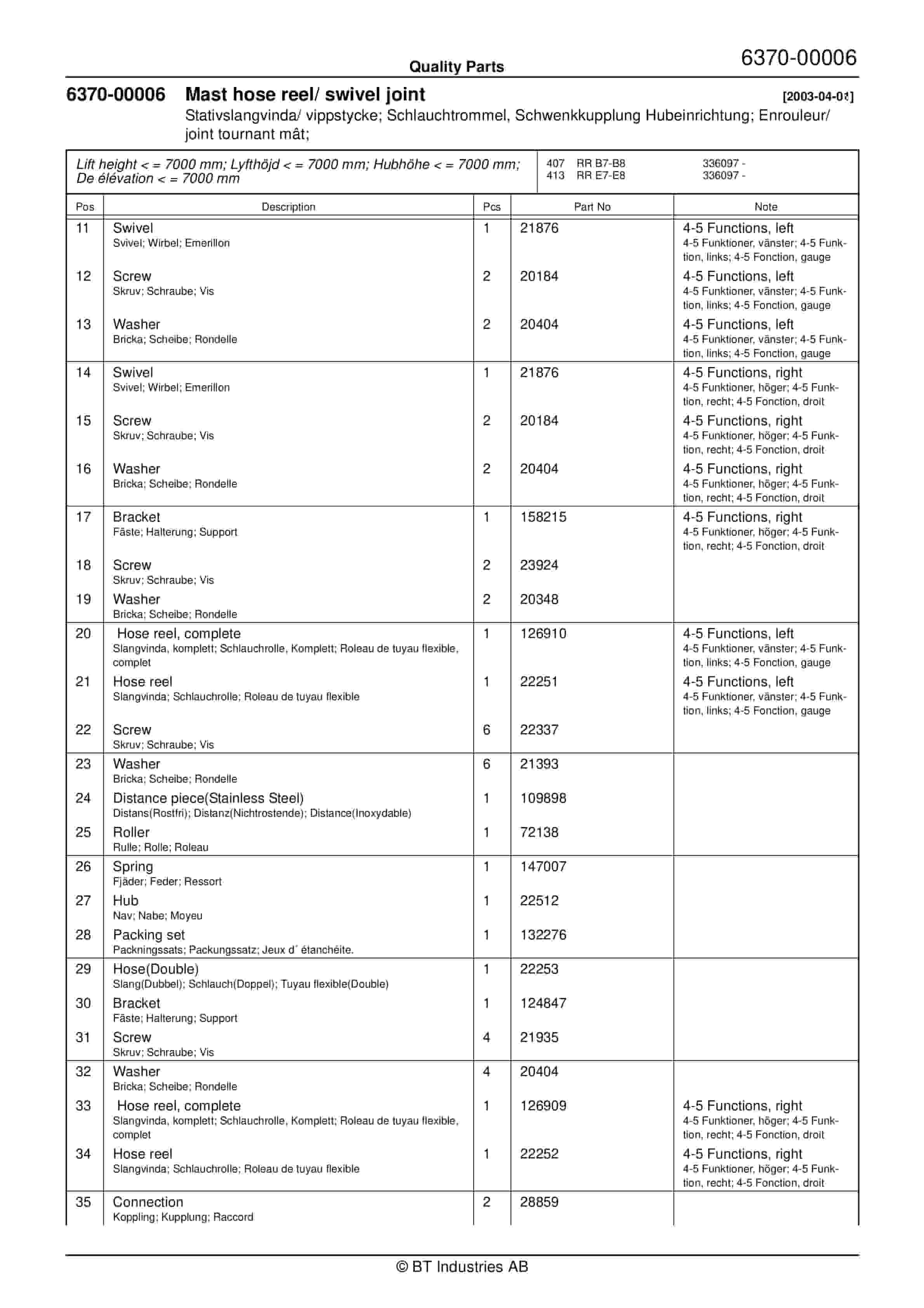 BT BTL20EW, BTL20EWO, BTL30EW, BTL30EWO, L20BR, L20BRO, L30BR, L30BRO Quality Parts 177967