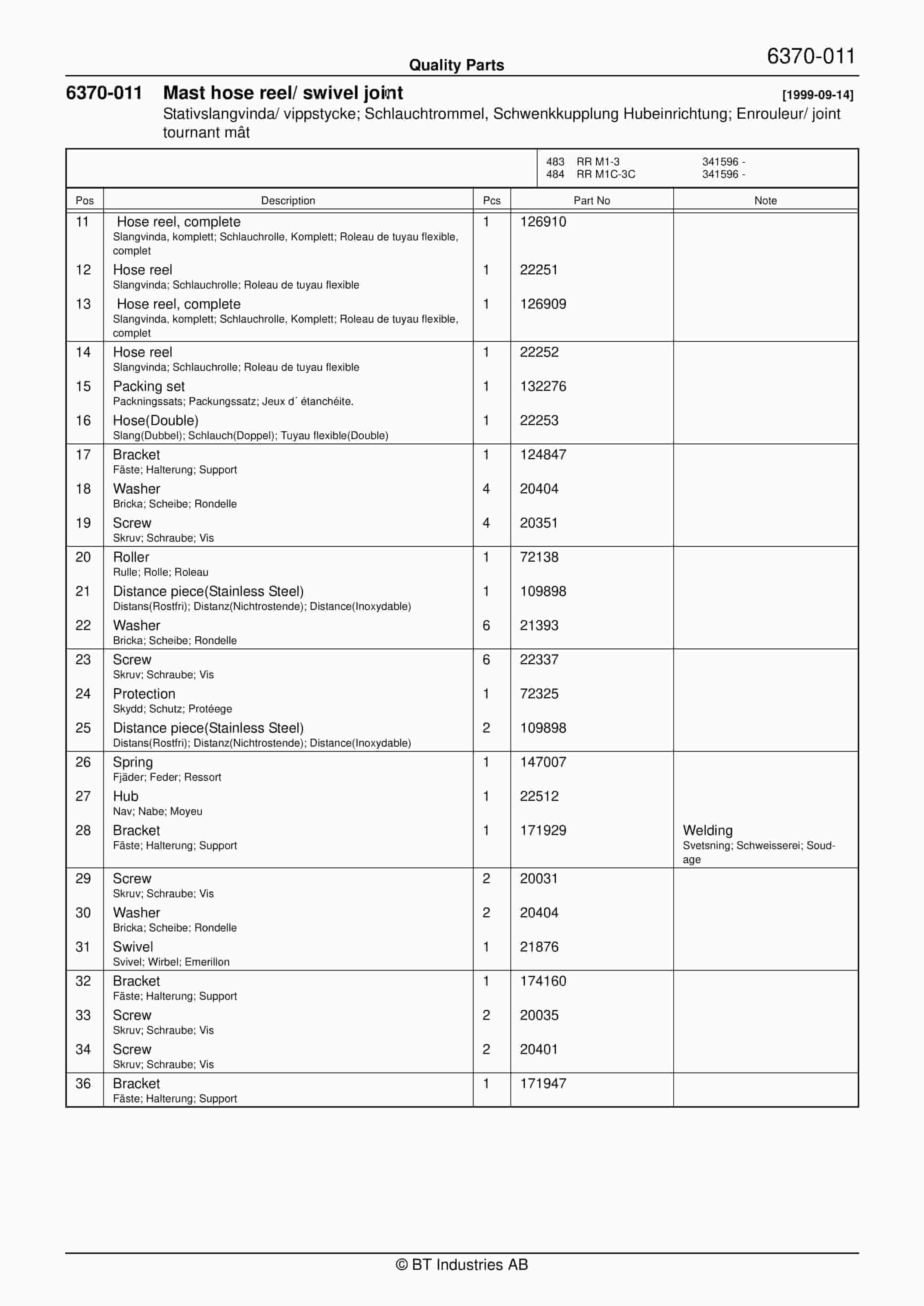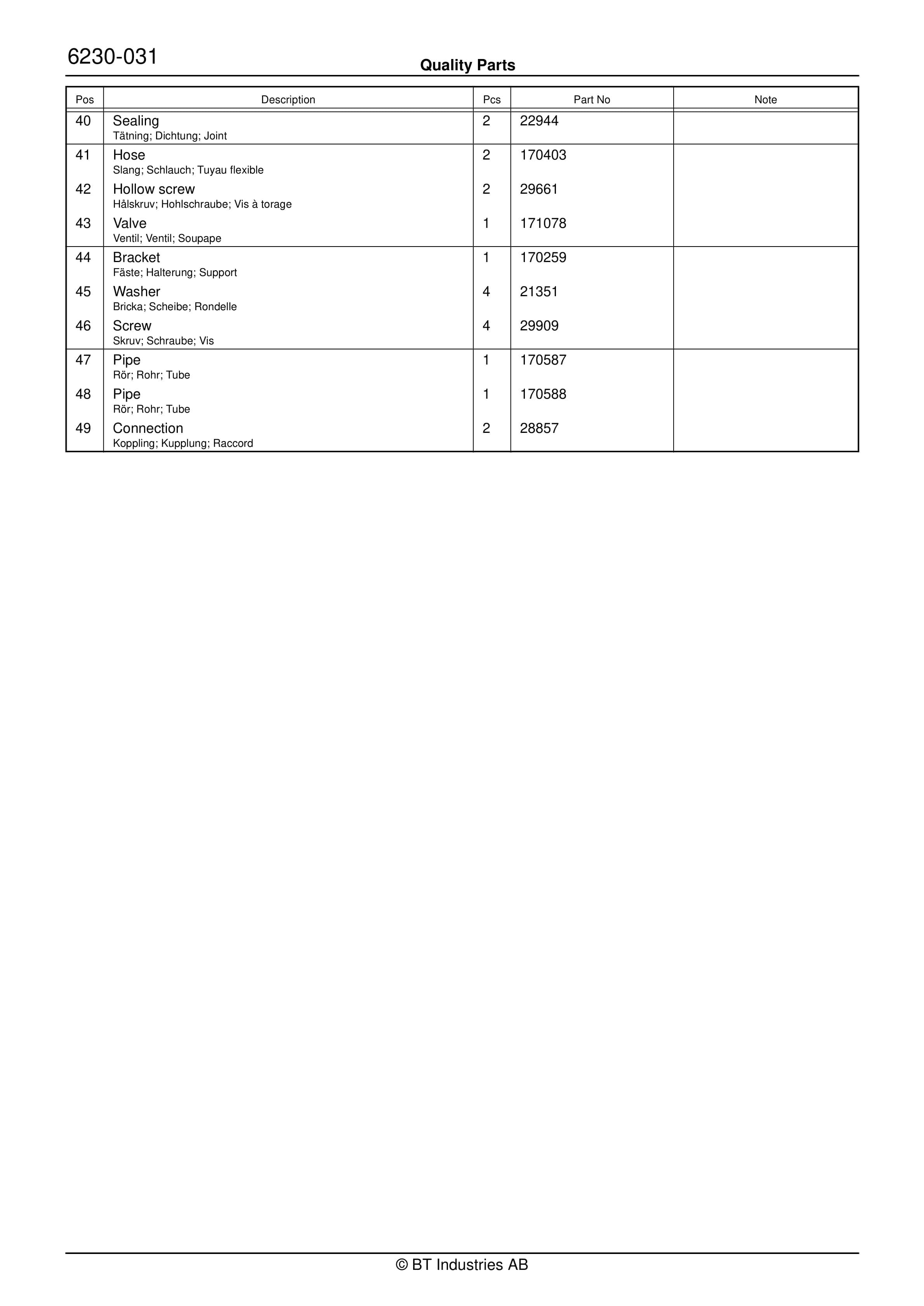 BT BTL20EW, BTL20EWO, BTL30EW, BTL30EWO, L20BR, L20BRO, L30BR, L30BRO Quality Parts 177967