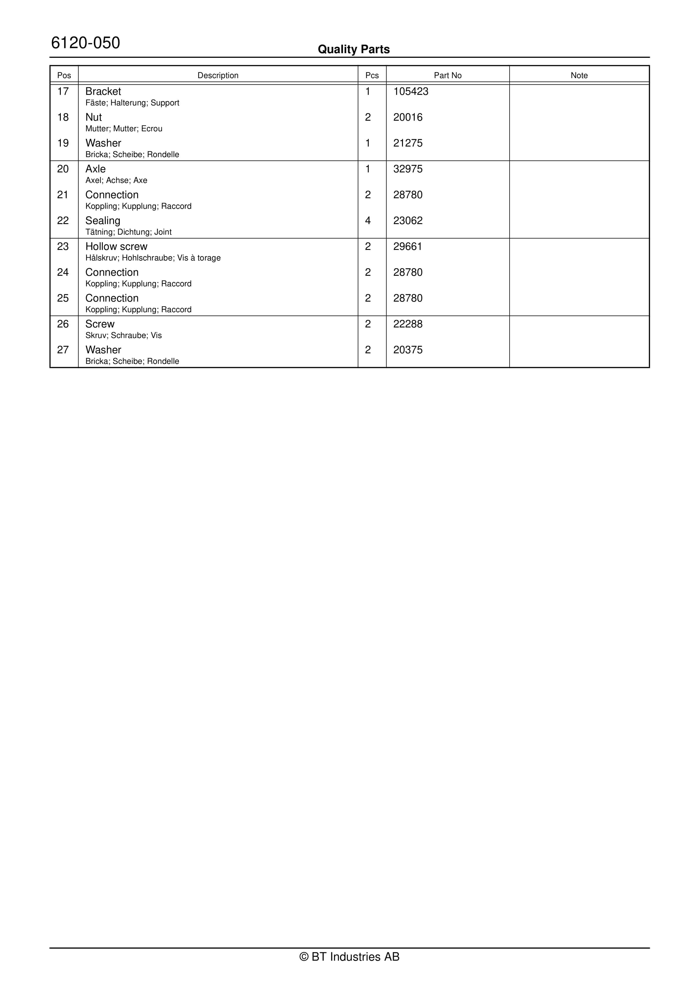 BT BTL20EW, BTL20EWO, BTL30EW, BTL30EWO, L20BR, L20BRO, L30BR, L30BRO Quality Parts 177967
