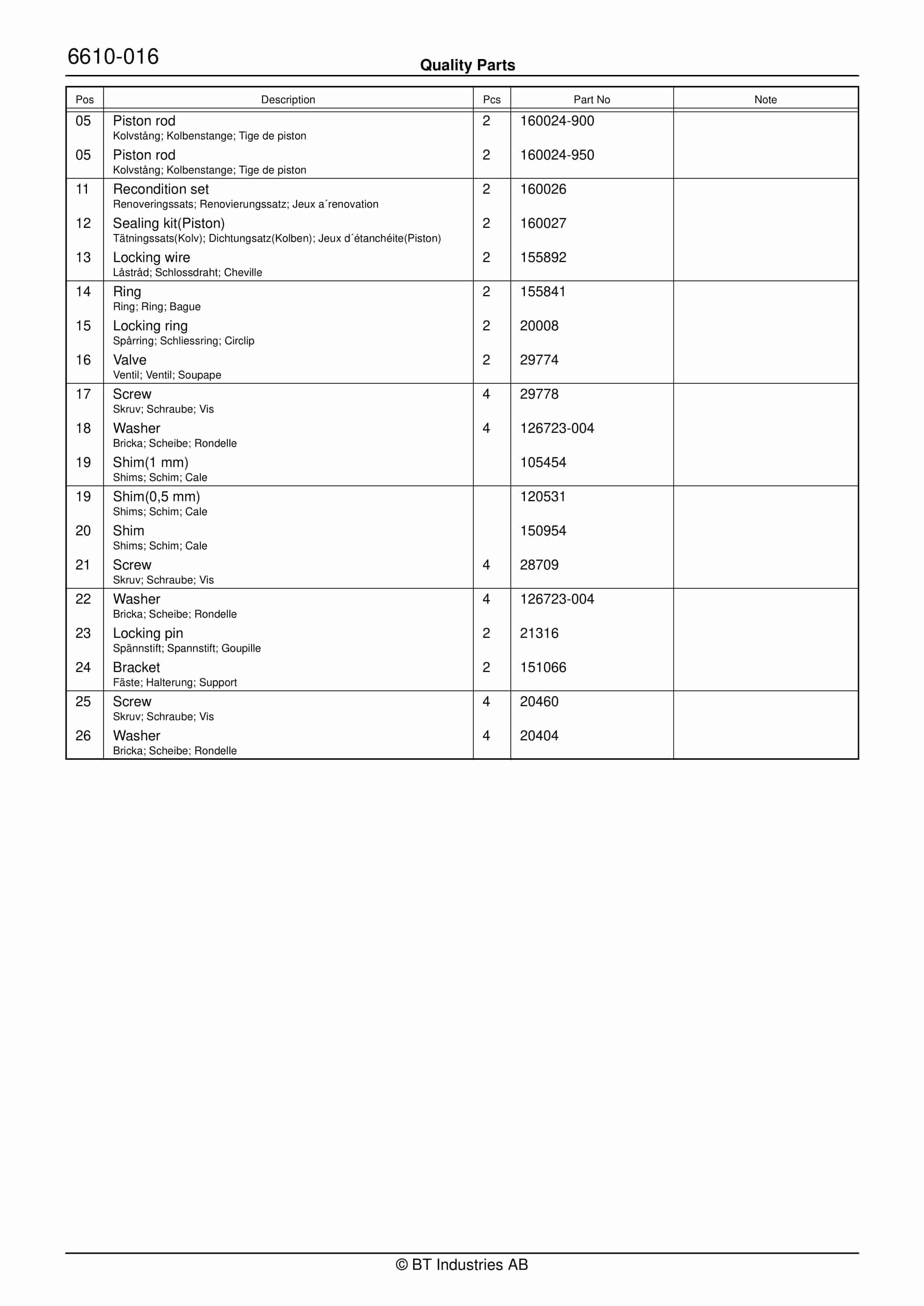 BT BTL20EW, BTL20EWO, BTL30EW, BTL30EWO, L20BR, L20BRO, L30BR, L30BRO Quality Parts 177967