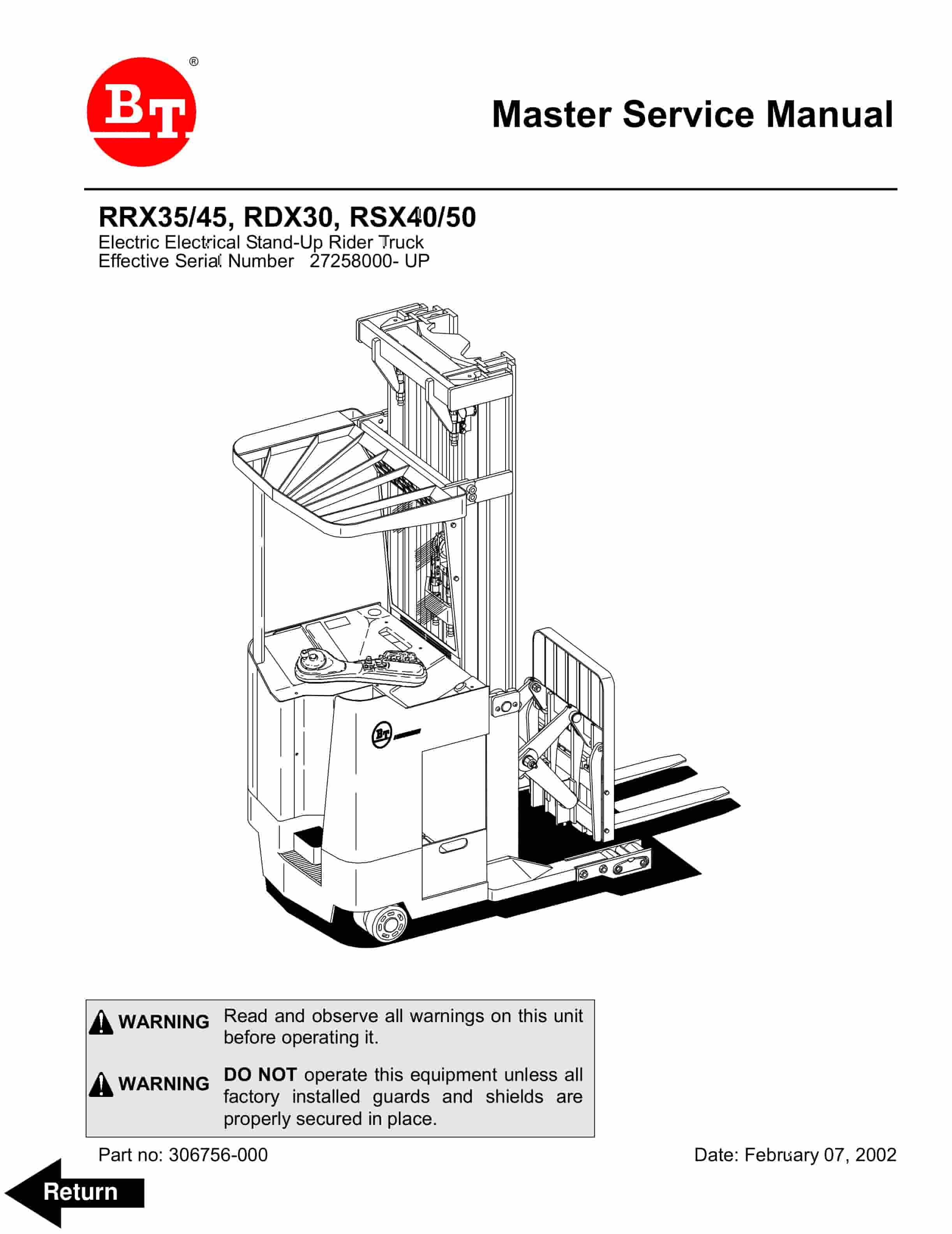 BT RRX35, RRX45, RDX30, RSX40, RSX50 Electric Stand-Up Rider Truck Service Manual 306756-000
