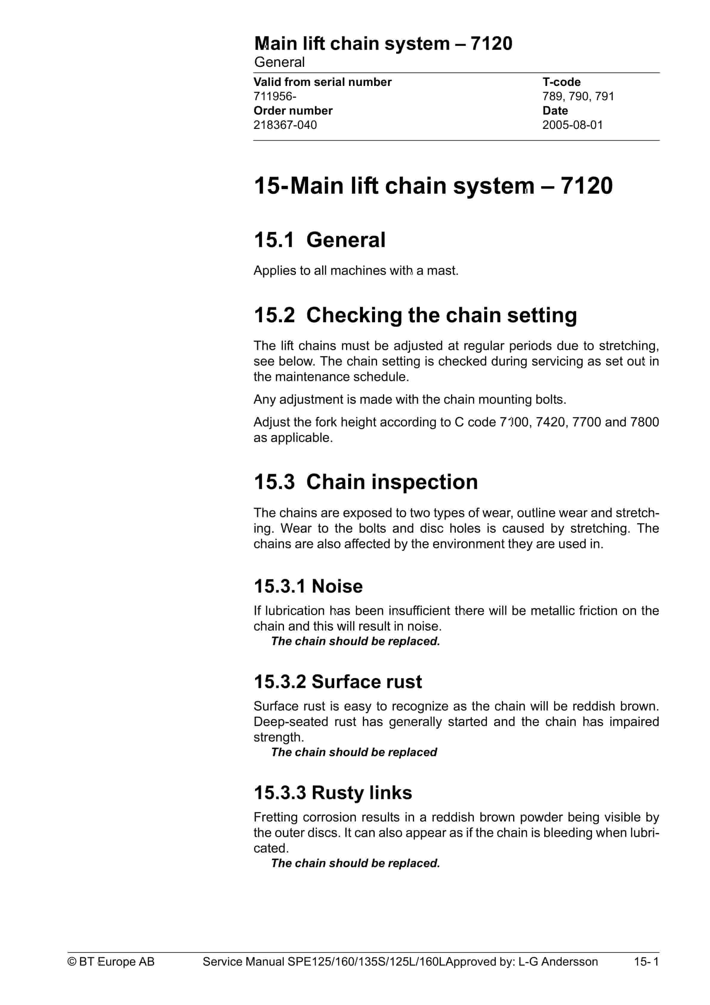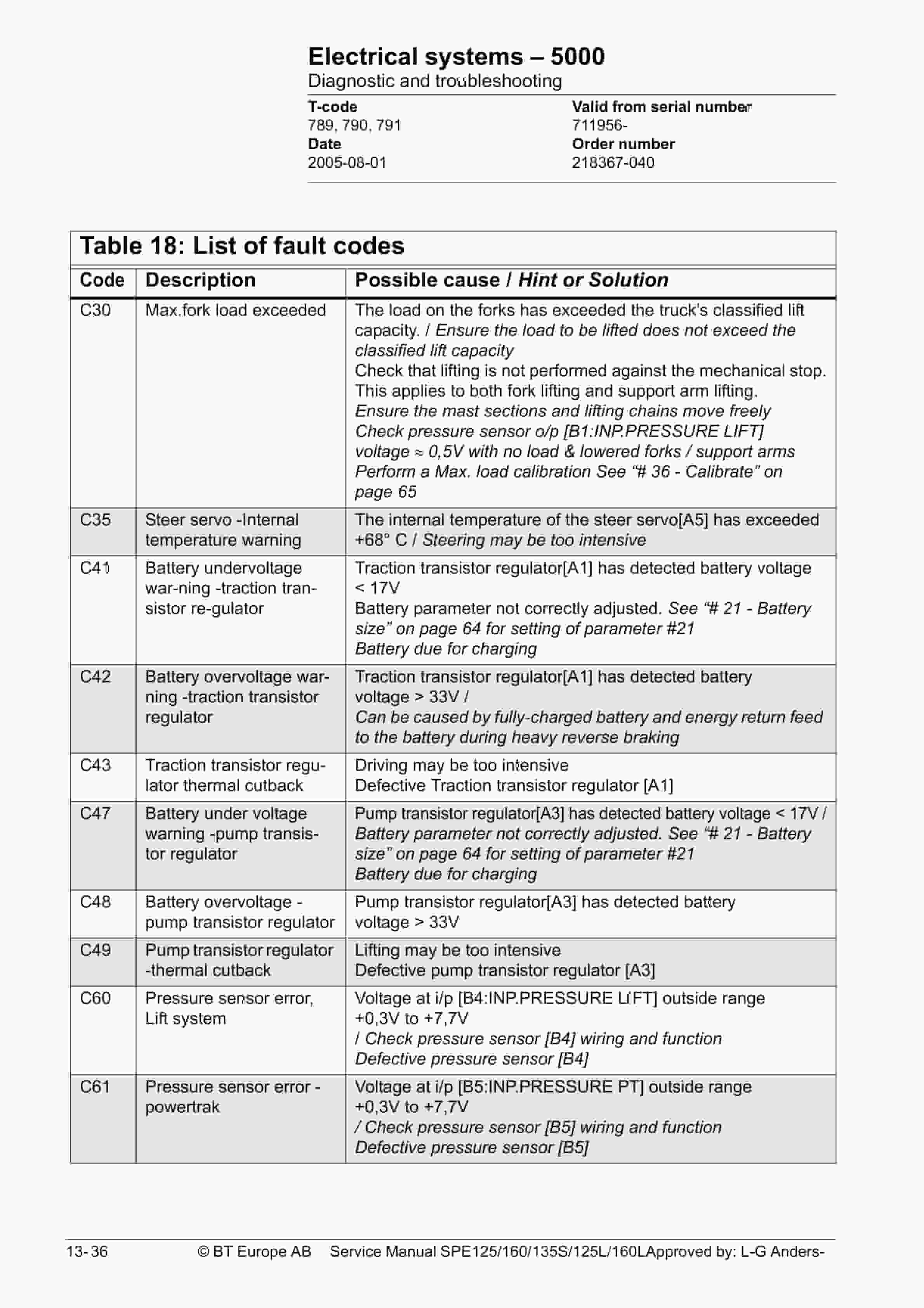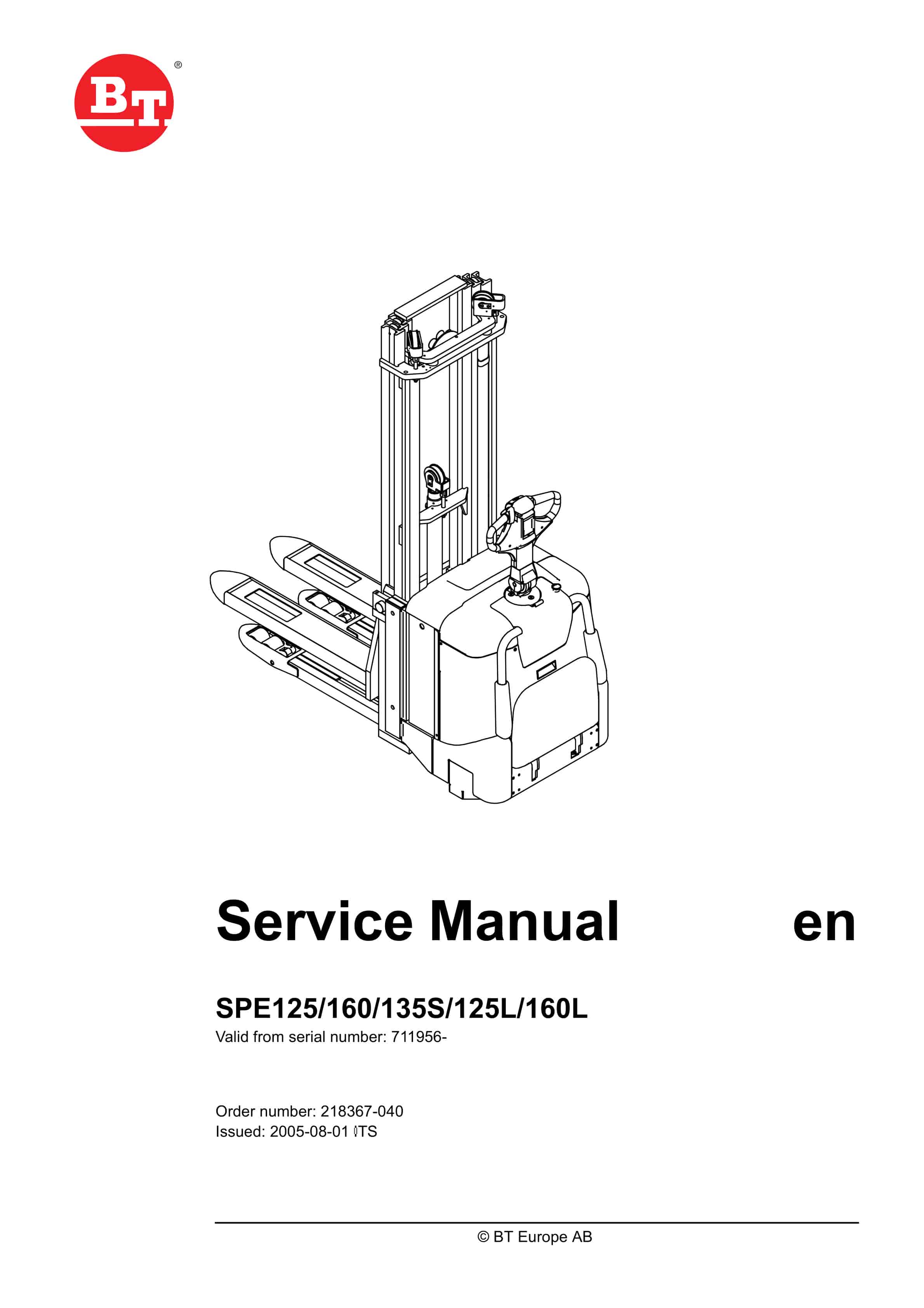 BT SPE125, SPE125L, SPE135S, SPE160, SPE160L Service Manual 218367-040