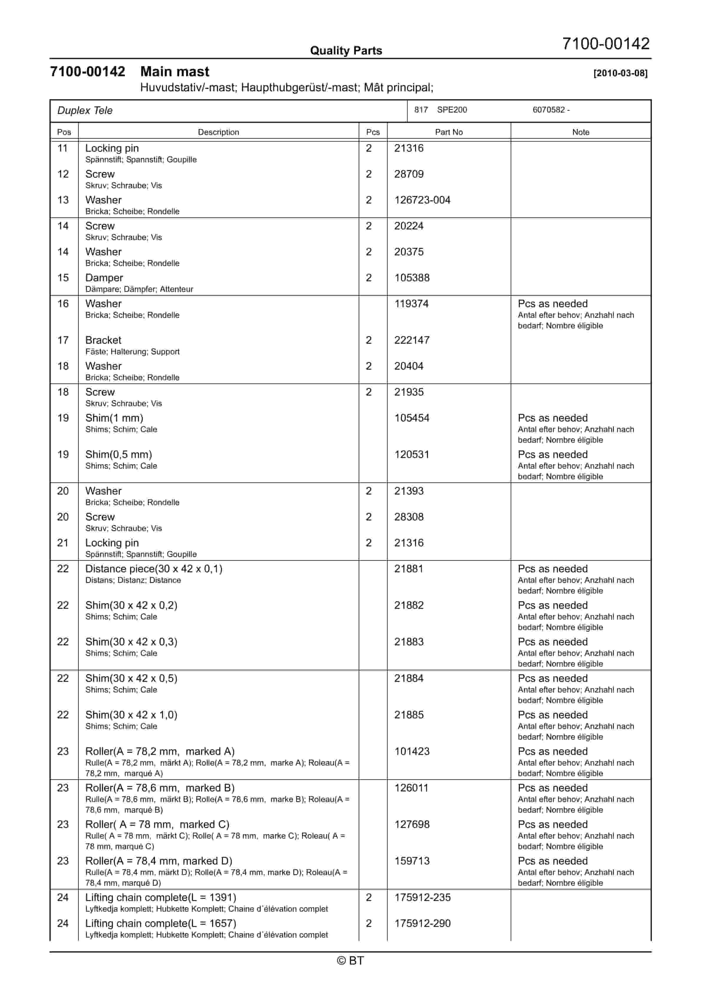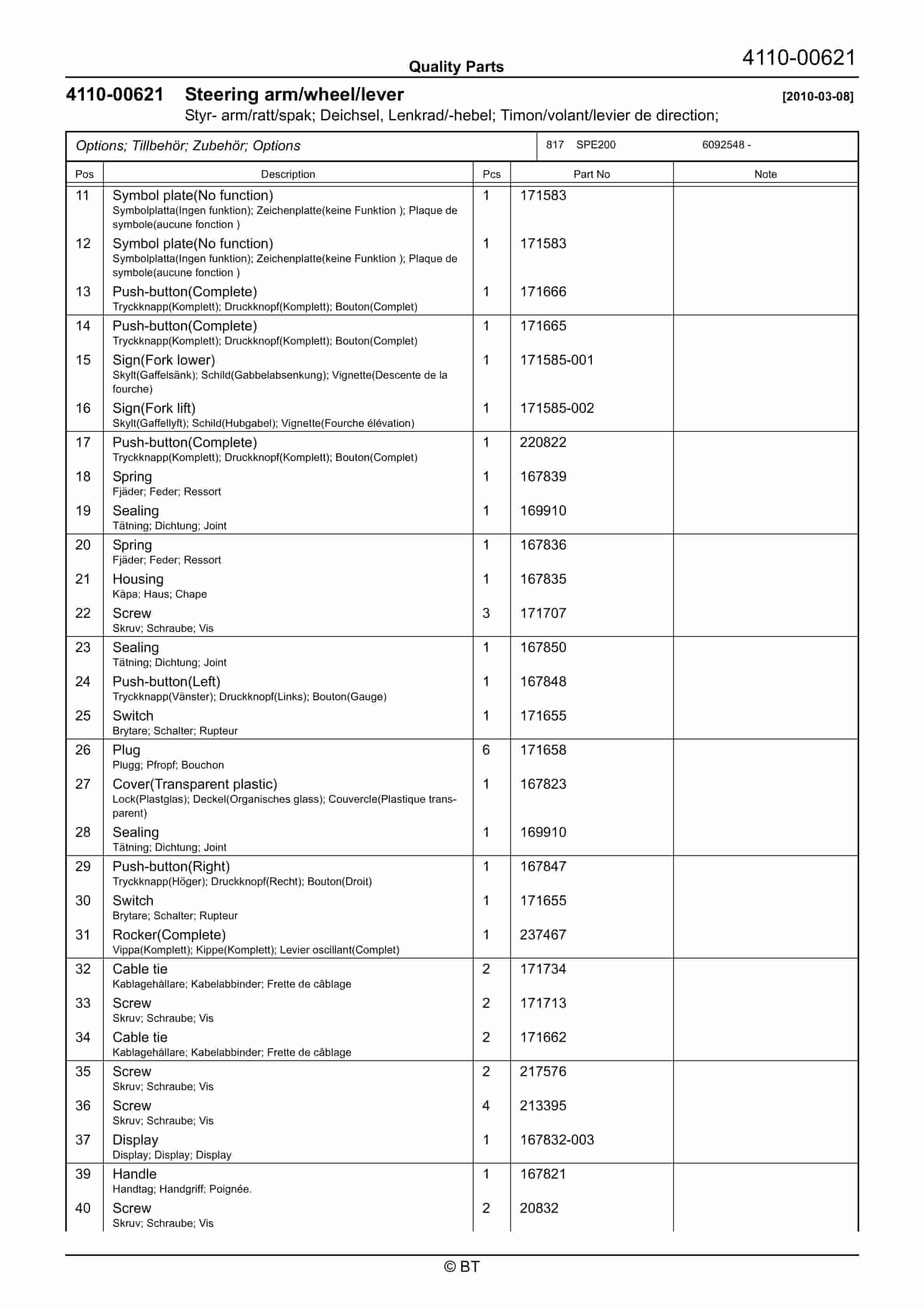 BT BTL20EW, BTL20EWO, BTL30EW, BTL30EWO, L20BR, L20BRO, L30BR, L30BRO Quality Parts 177967
