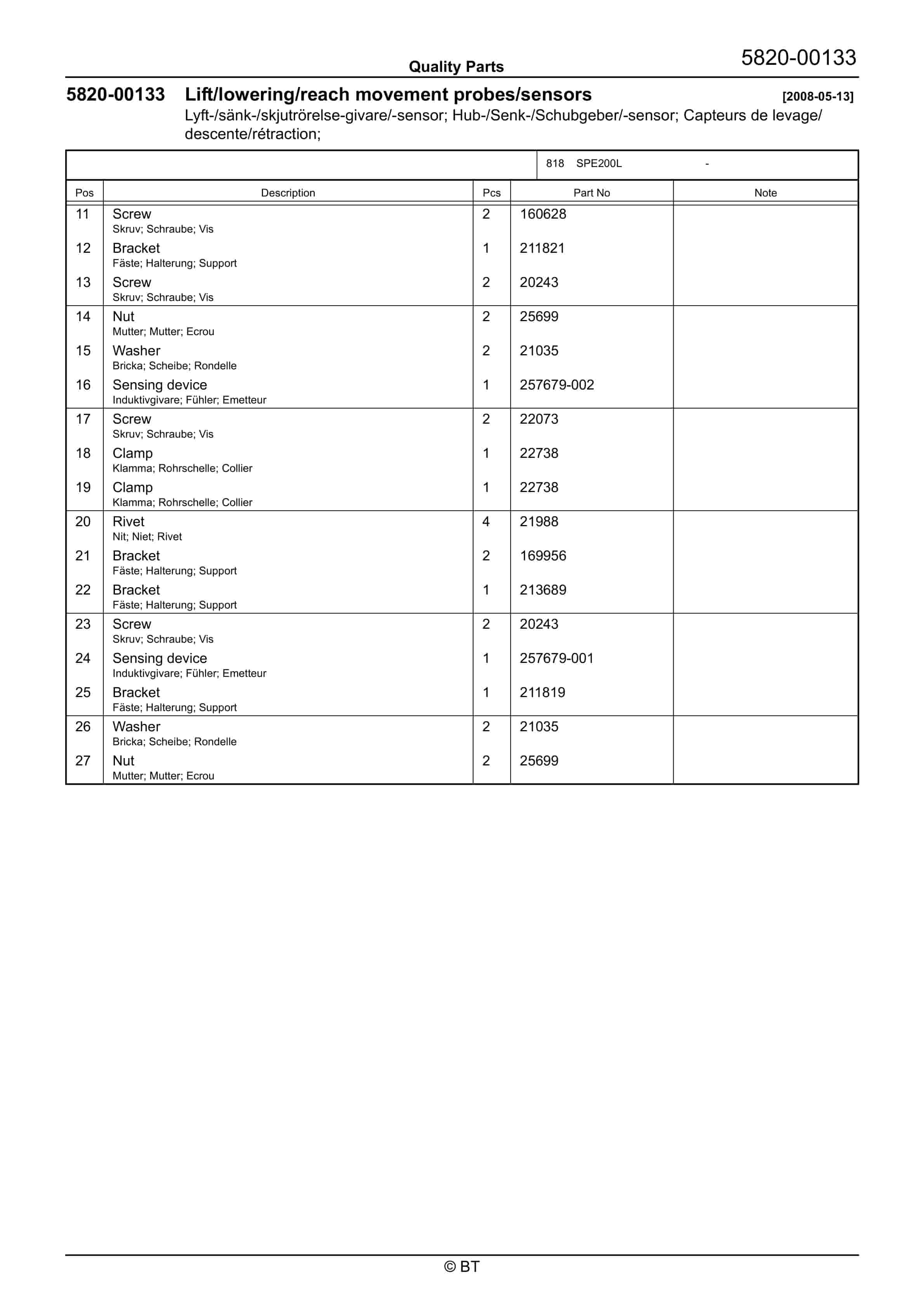 BT 604-TT, 609-TT, 610-TT, 612-TT, 602-TT, 608-TT Quality Parts 180727