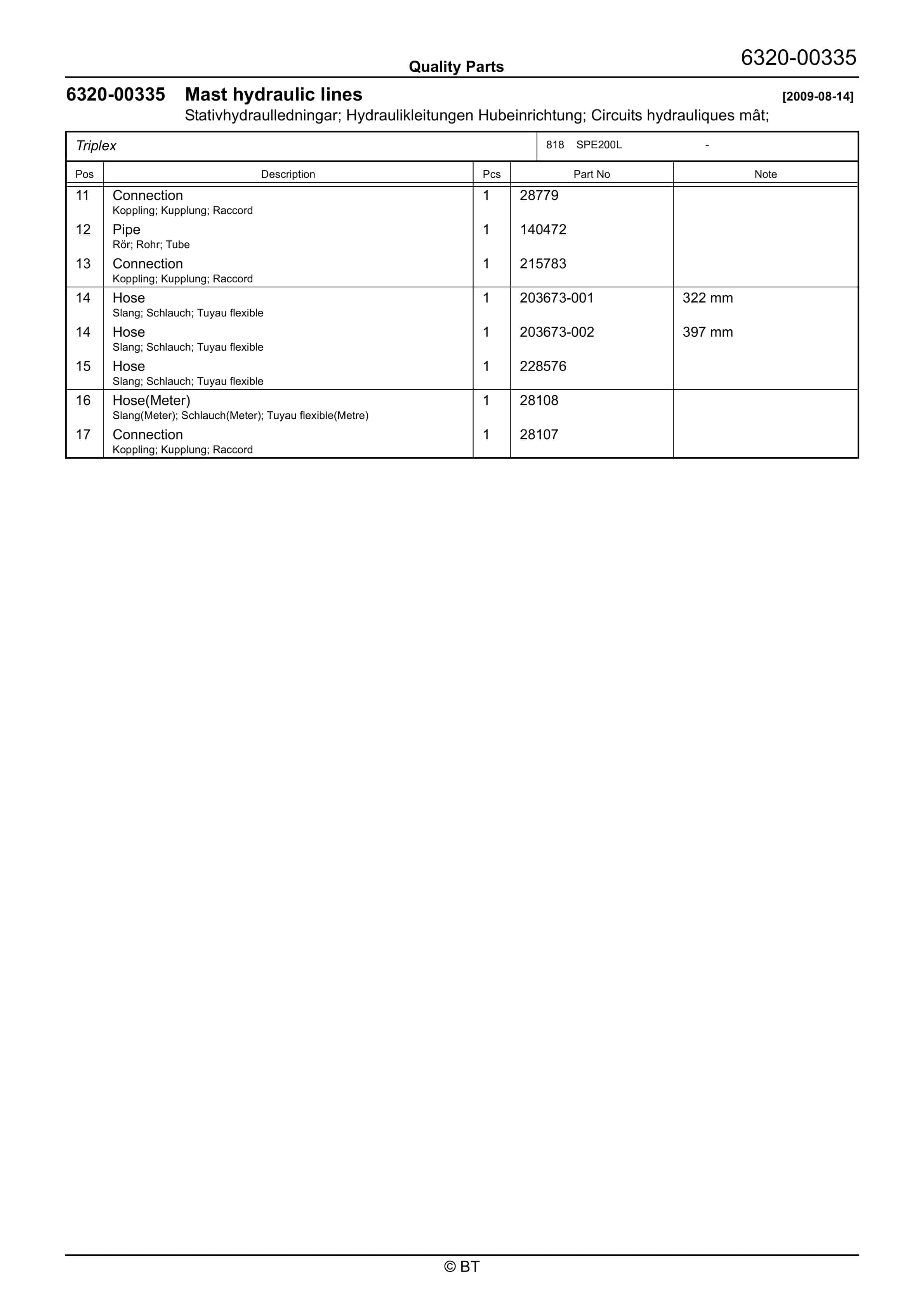 BT BTL20EW, BTL20EWO, BTL30EW, BTL30EWO, L20BR, L20BRO, L30BR, L30BRO Quality Parts 177967