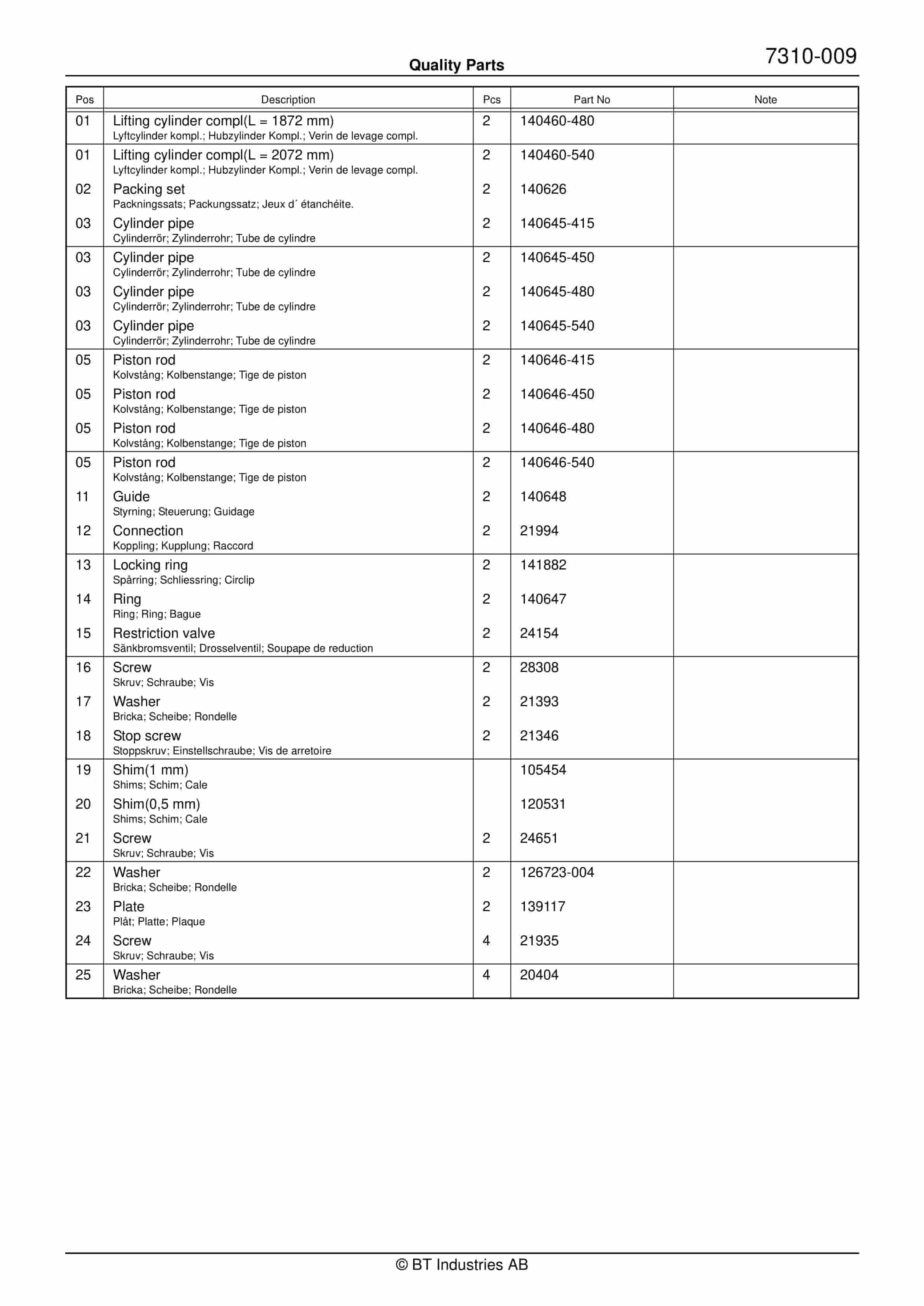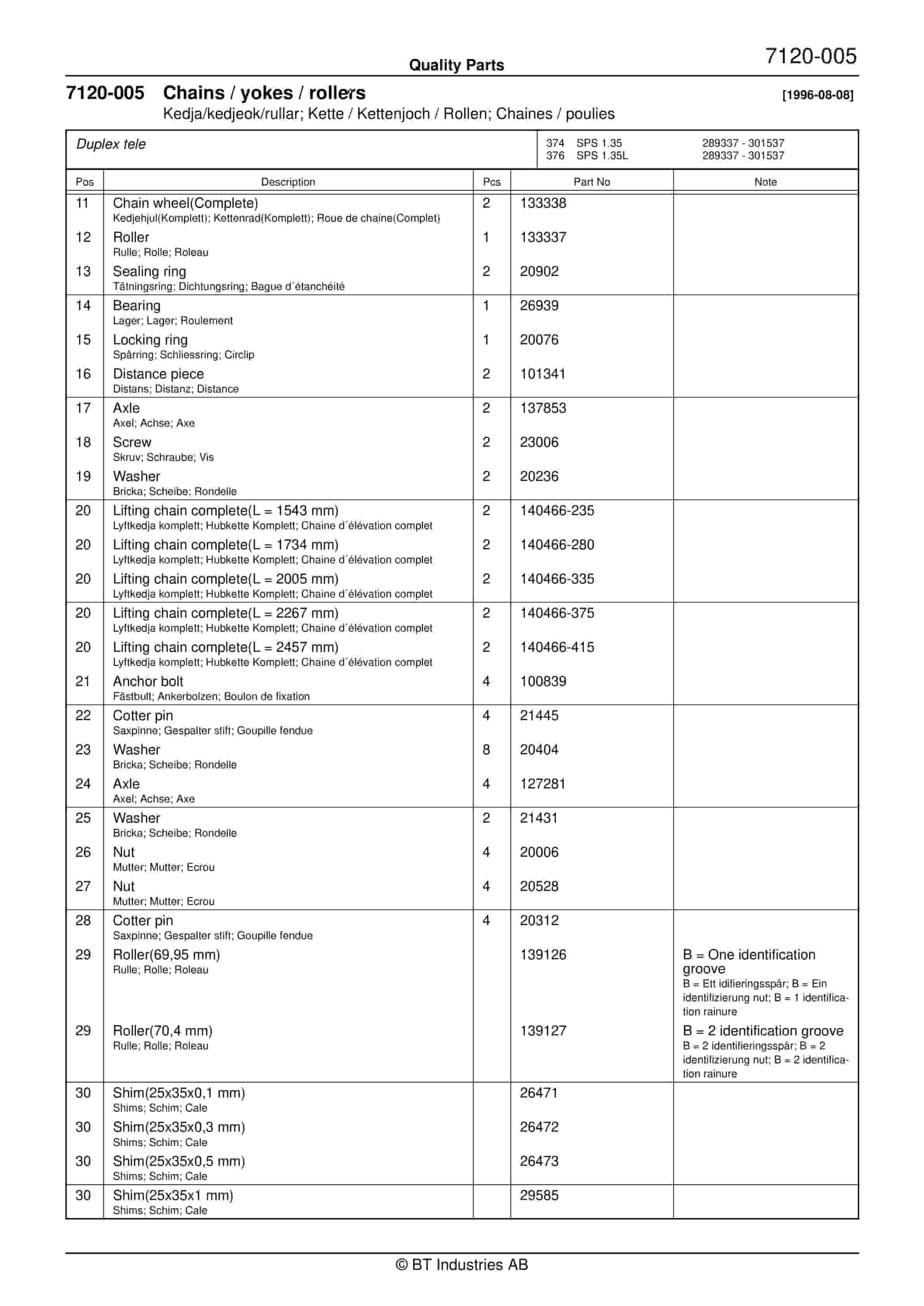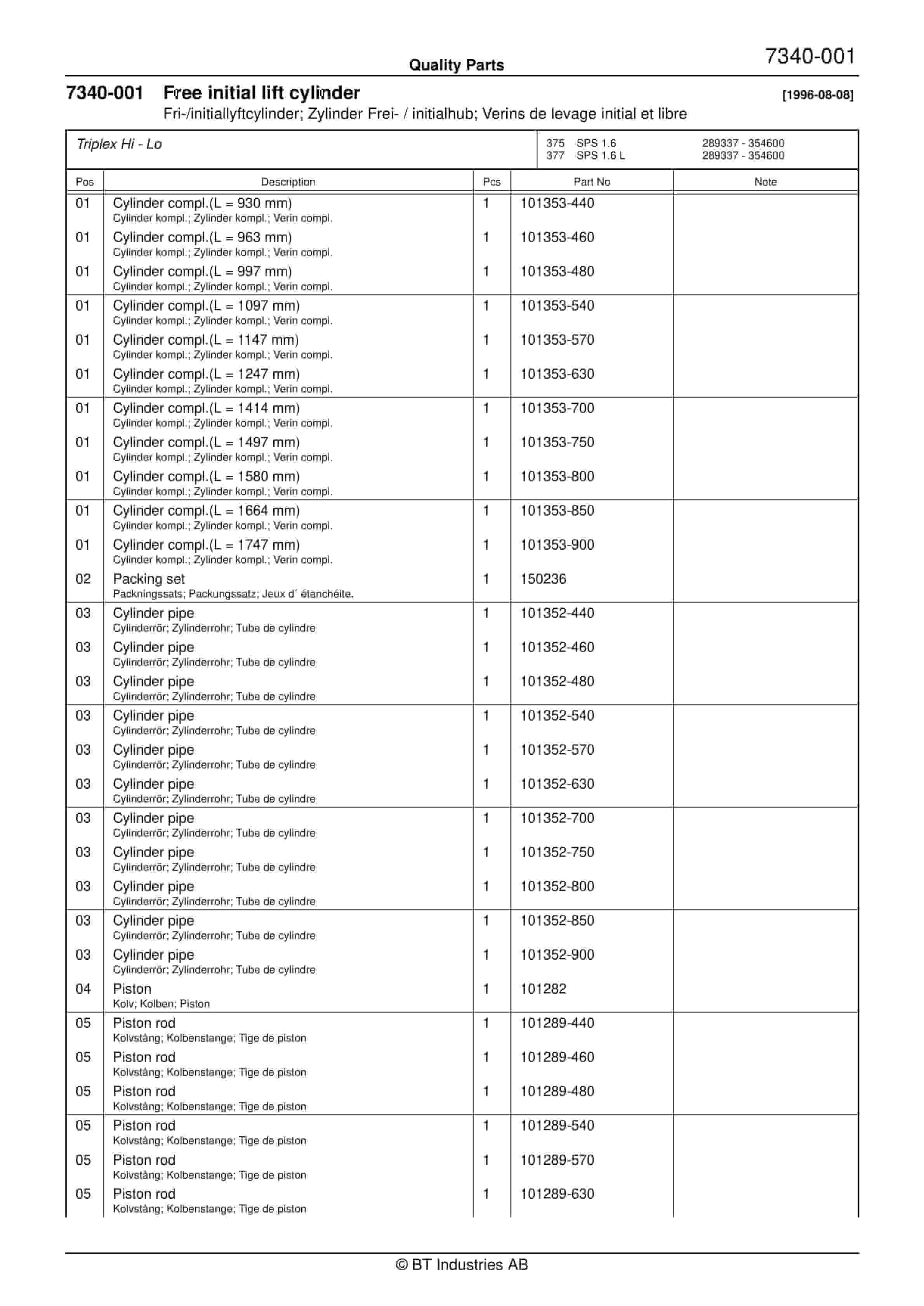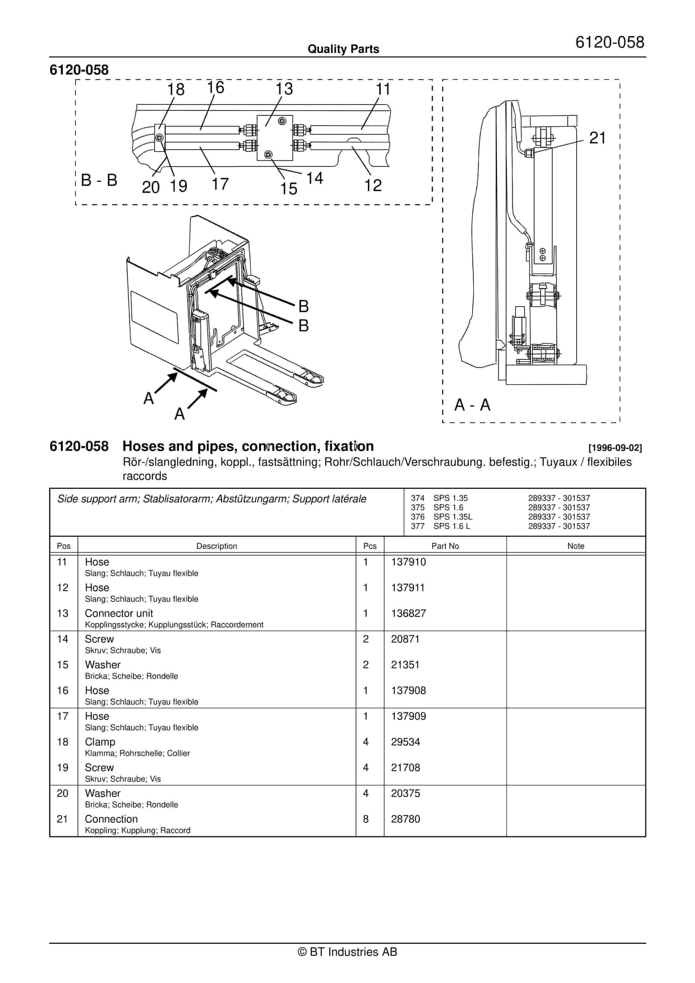 BT SPS 1.35, SPS 1.35L, SPS 1.6, SPS 1.6L Quality Parts 154806