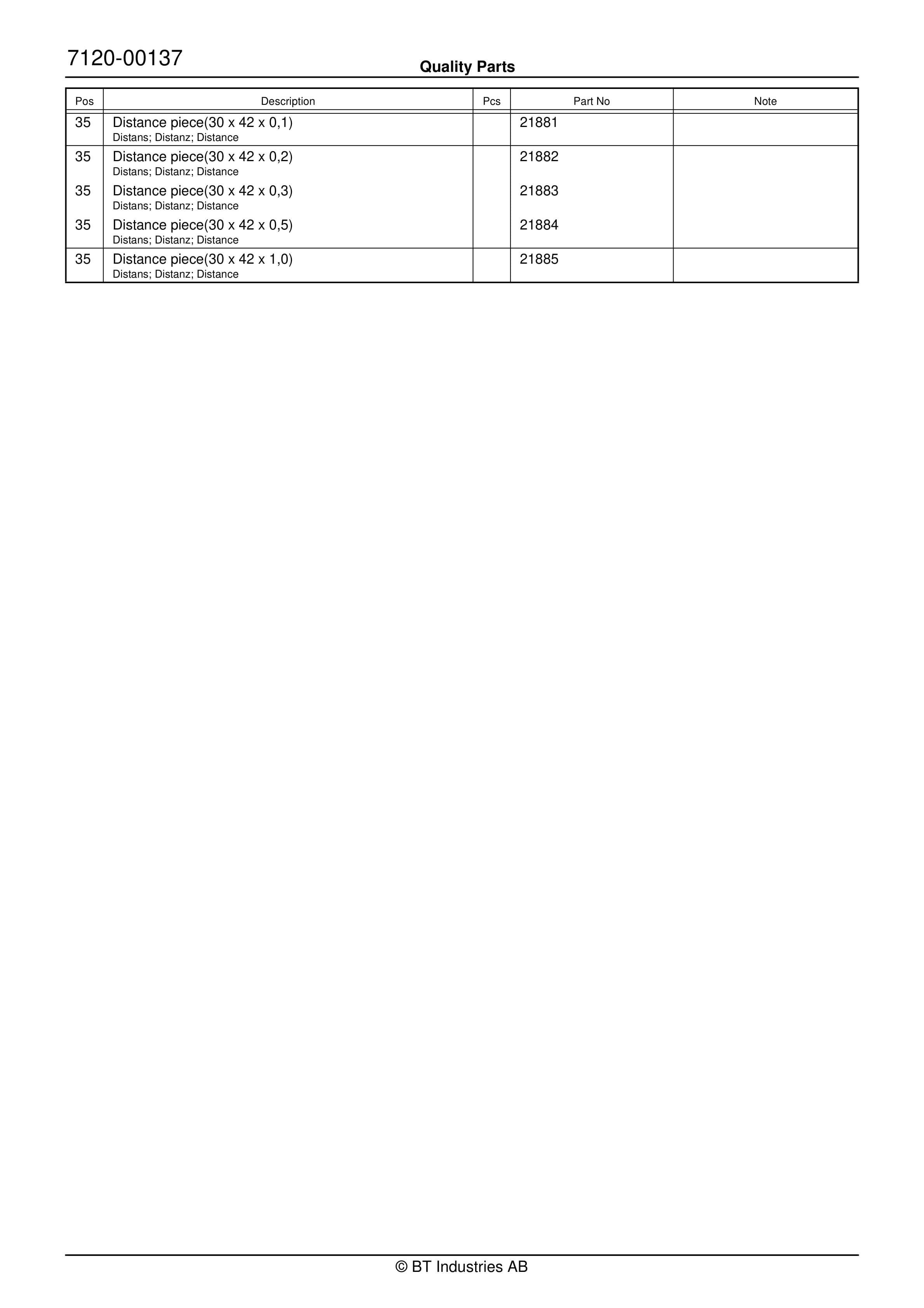 BT BTL20EW, BTL20EWO, BTL30EW, BTL30EWO, L20BR, L20BRO, L30BR, L30BRO Quality Parts 177967