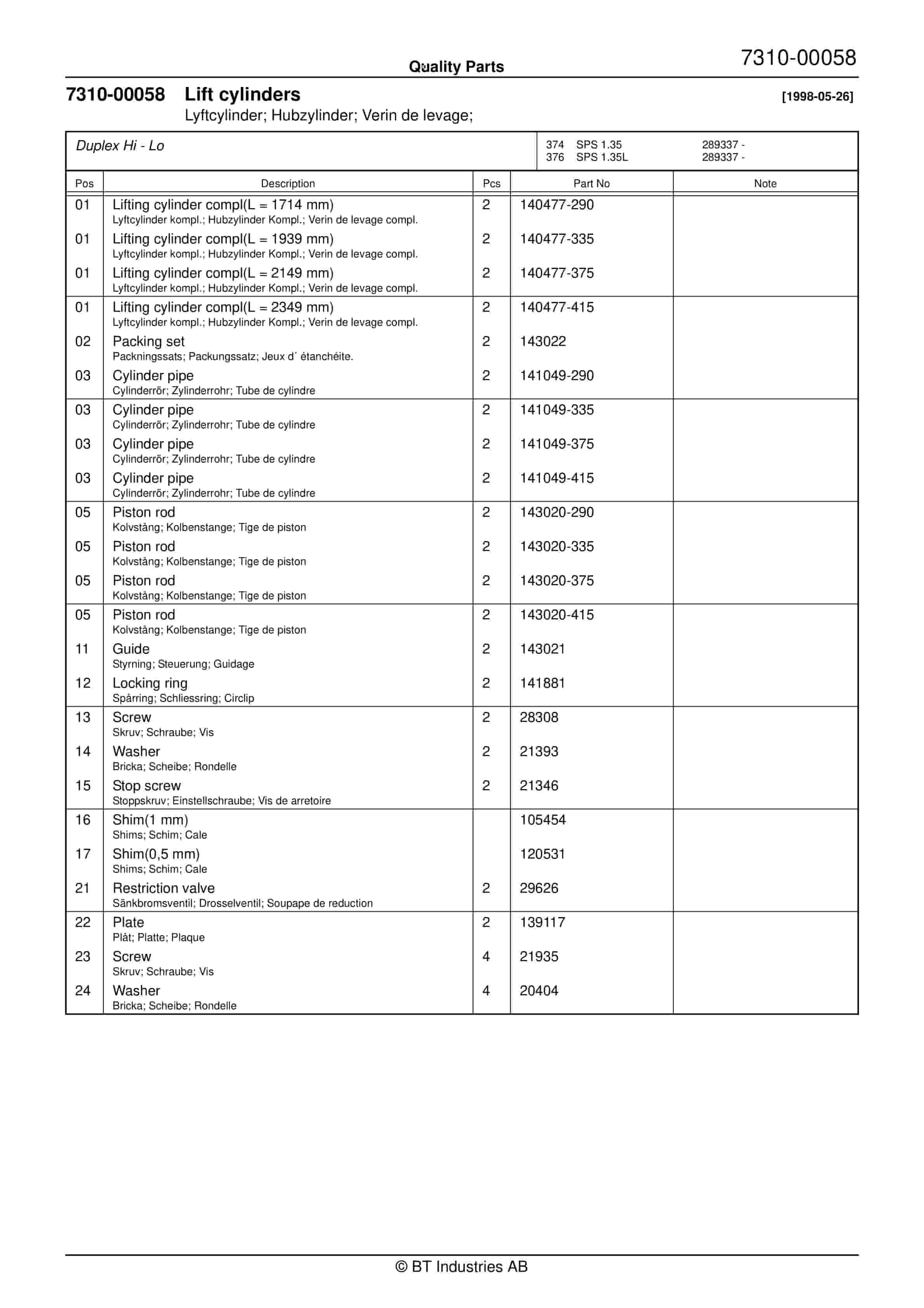 BT SPS 1.35, SPS 1.35L, SPS 1.6, SPS 1.6L Quality Parts 214814