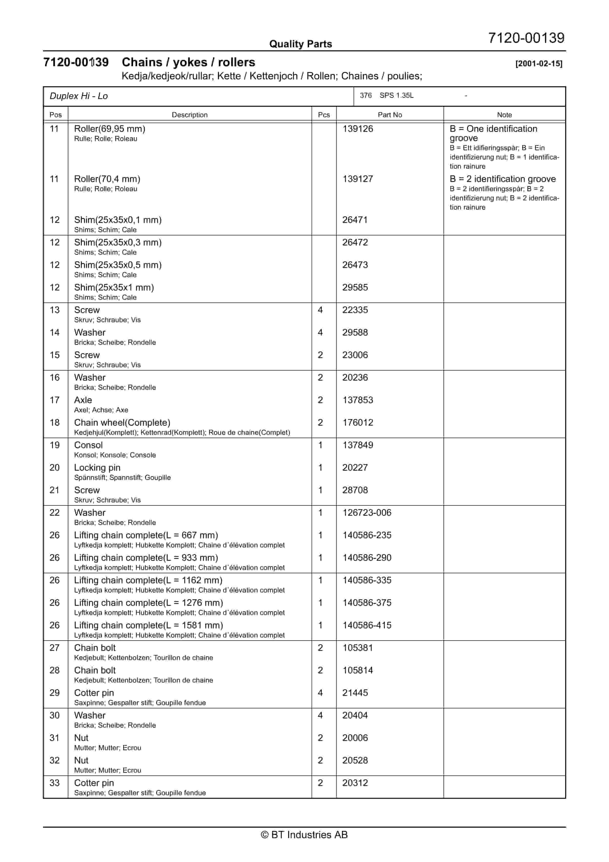 BT 602-TT, 608-TT, 609-TT, 610-TT, 612-TT, 620-TT (AC) Quality Parts 253711