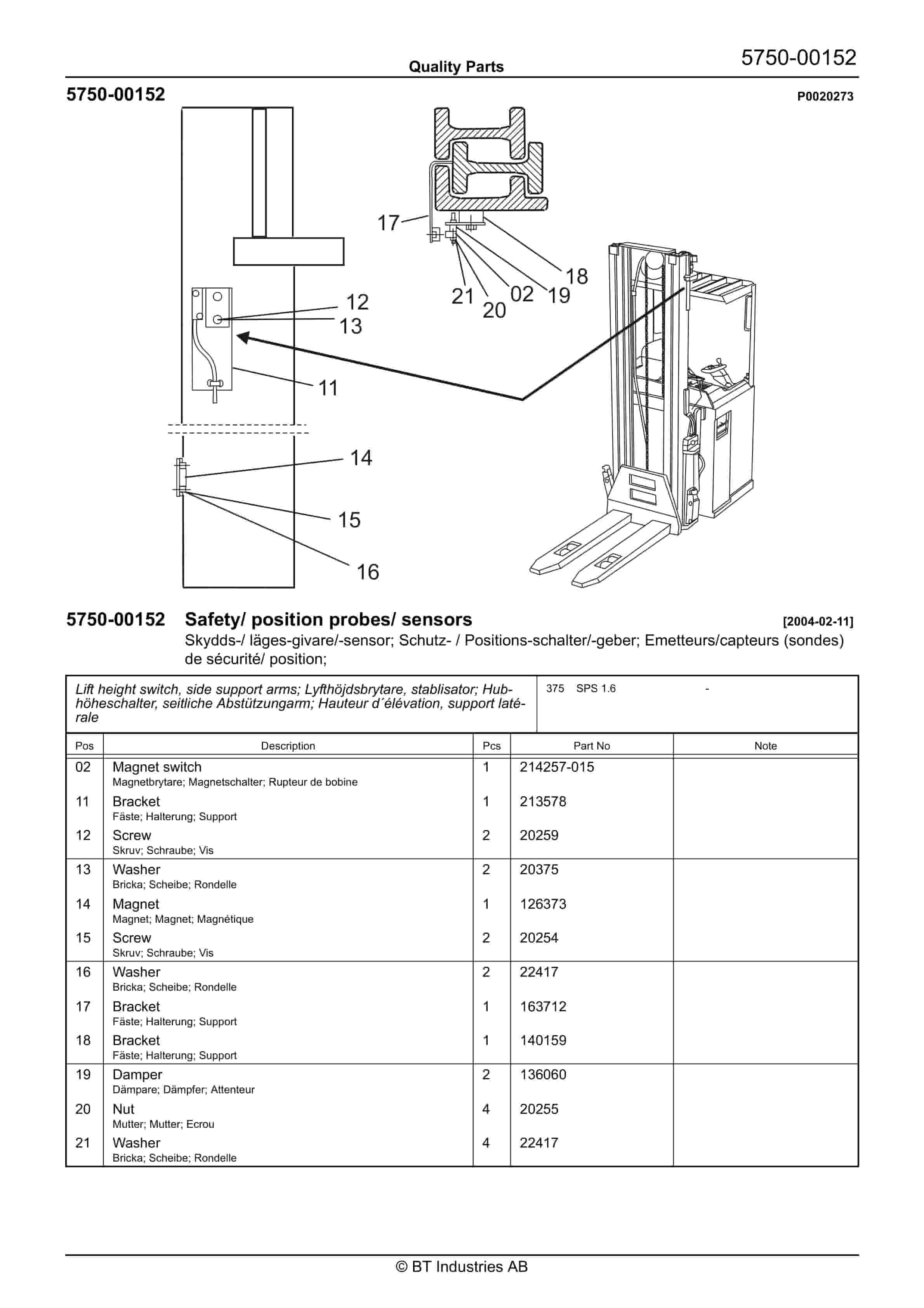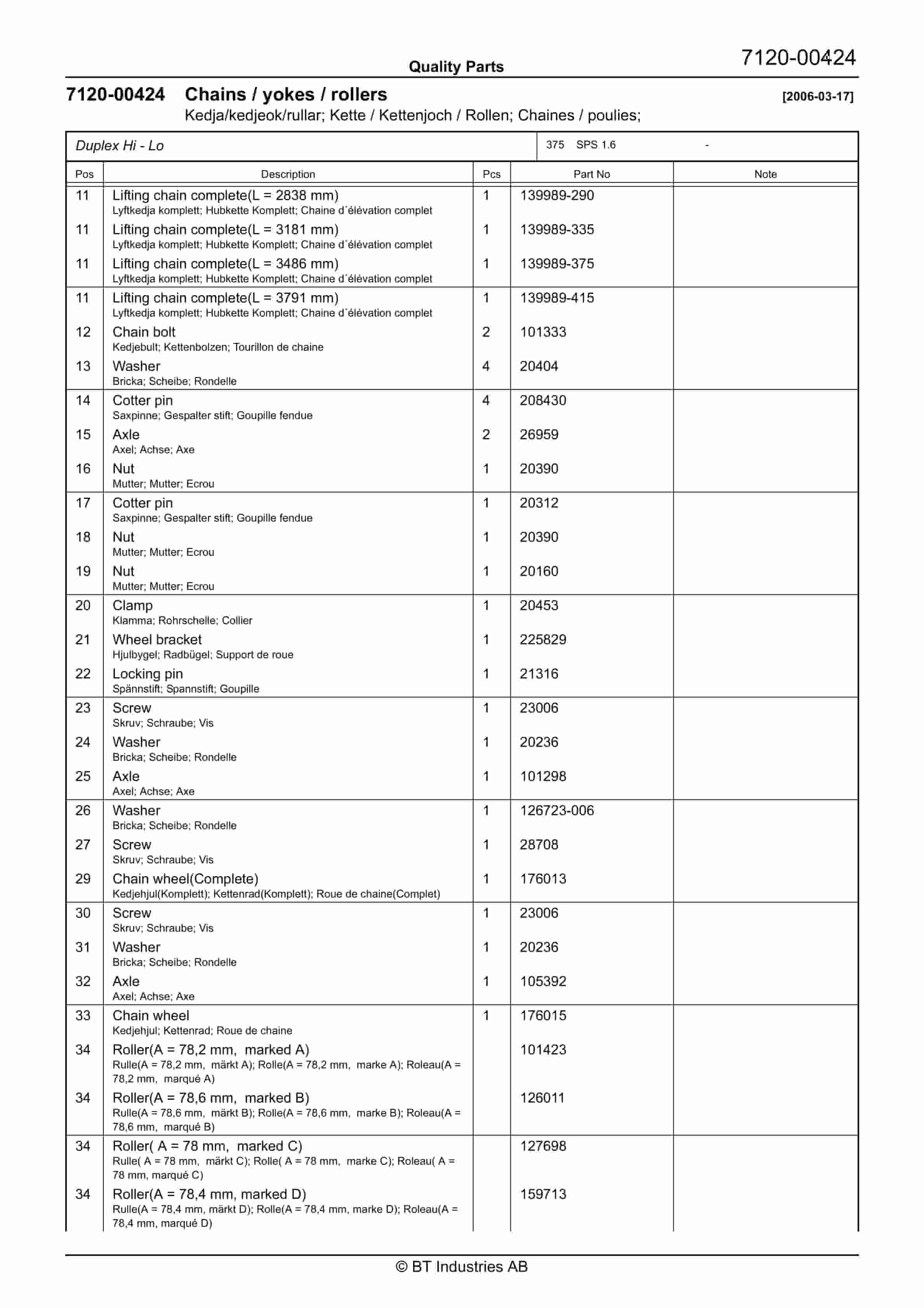 BT BTL20EW, BTL20EWO, BTL30EW, BTL30EWO, L20BR, L20BRO, L30BR, L30BRO Quality Parts 177967