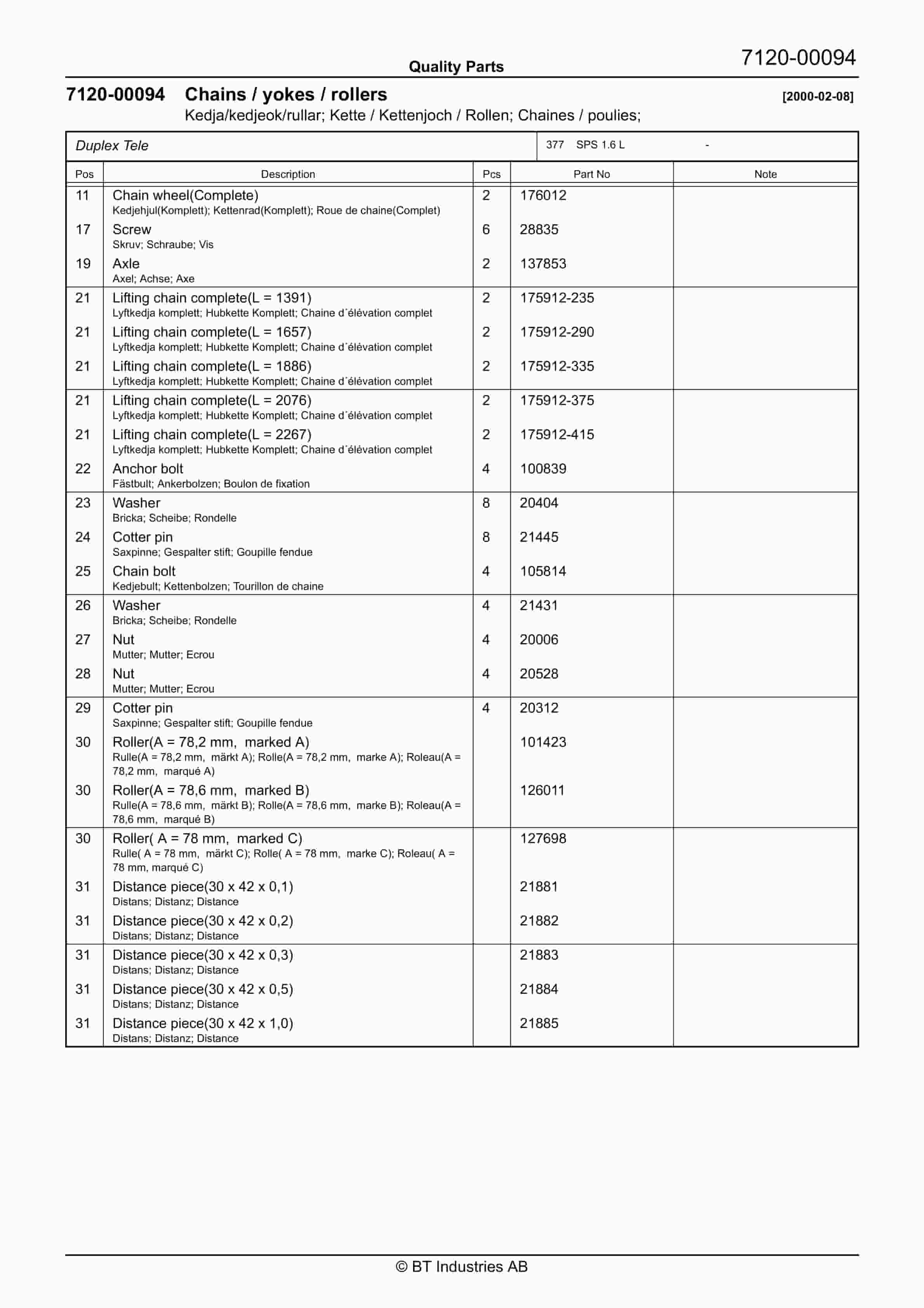 BT BTL2000, BTL2000I, BTL2000K, BTL2000O, BTL2000Q, BTL2000X, BTL2000U, BTL2000QX, Serial 11 Quality Parts 170417