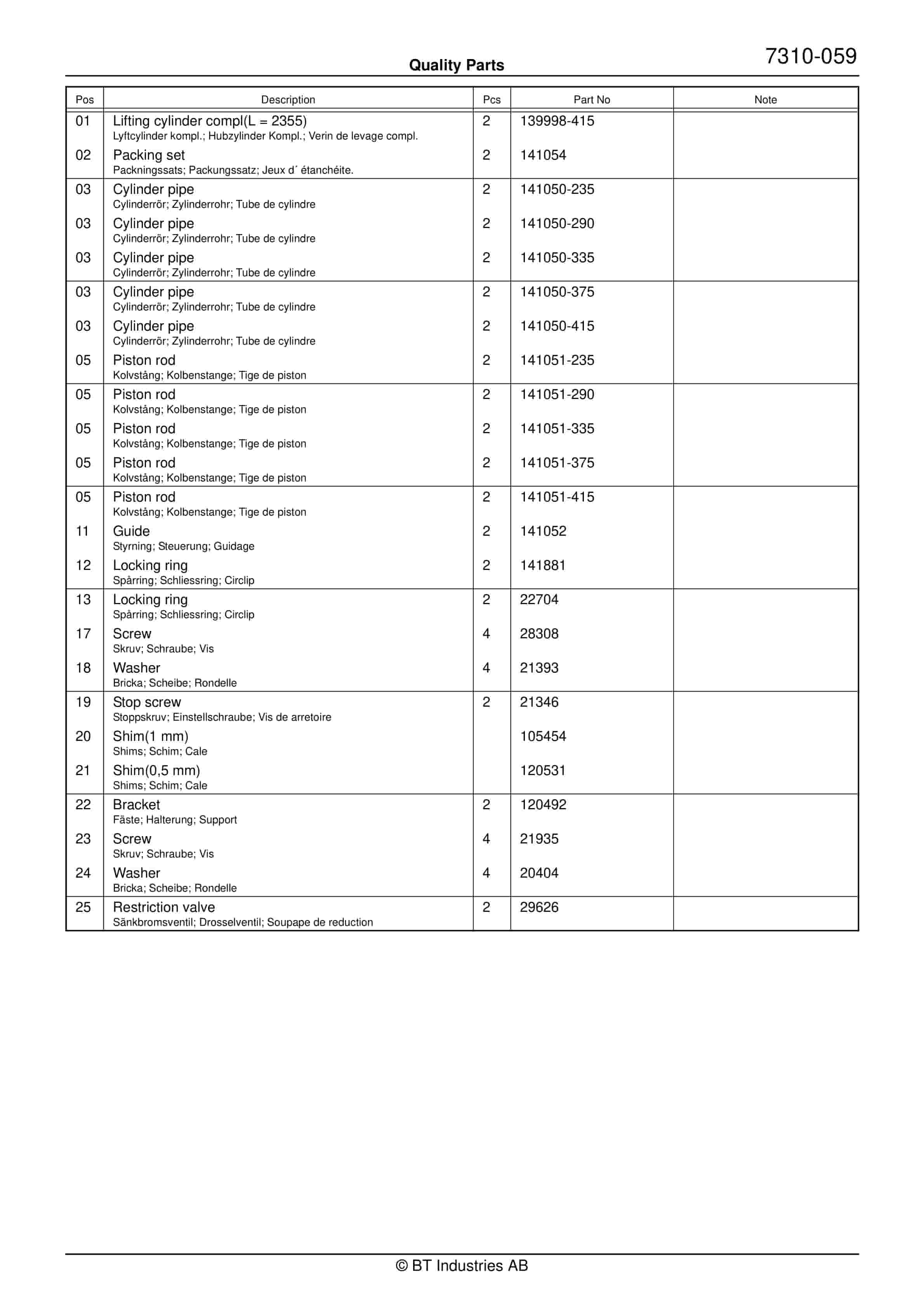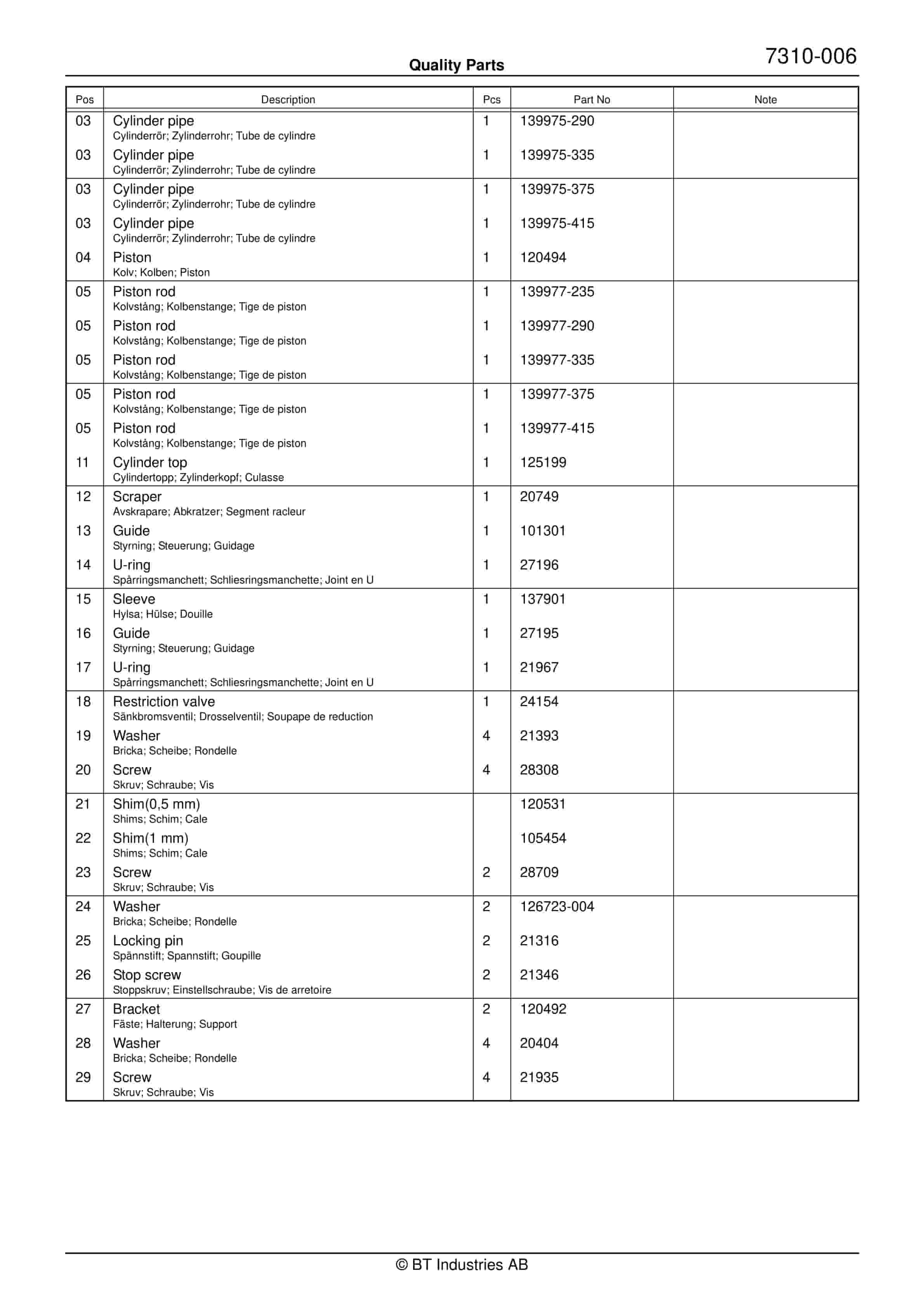 BT SR 1.35, SR 1.35L, SR 1.6, SR 1.6L Quality Parts 150696