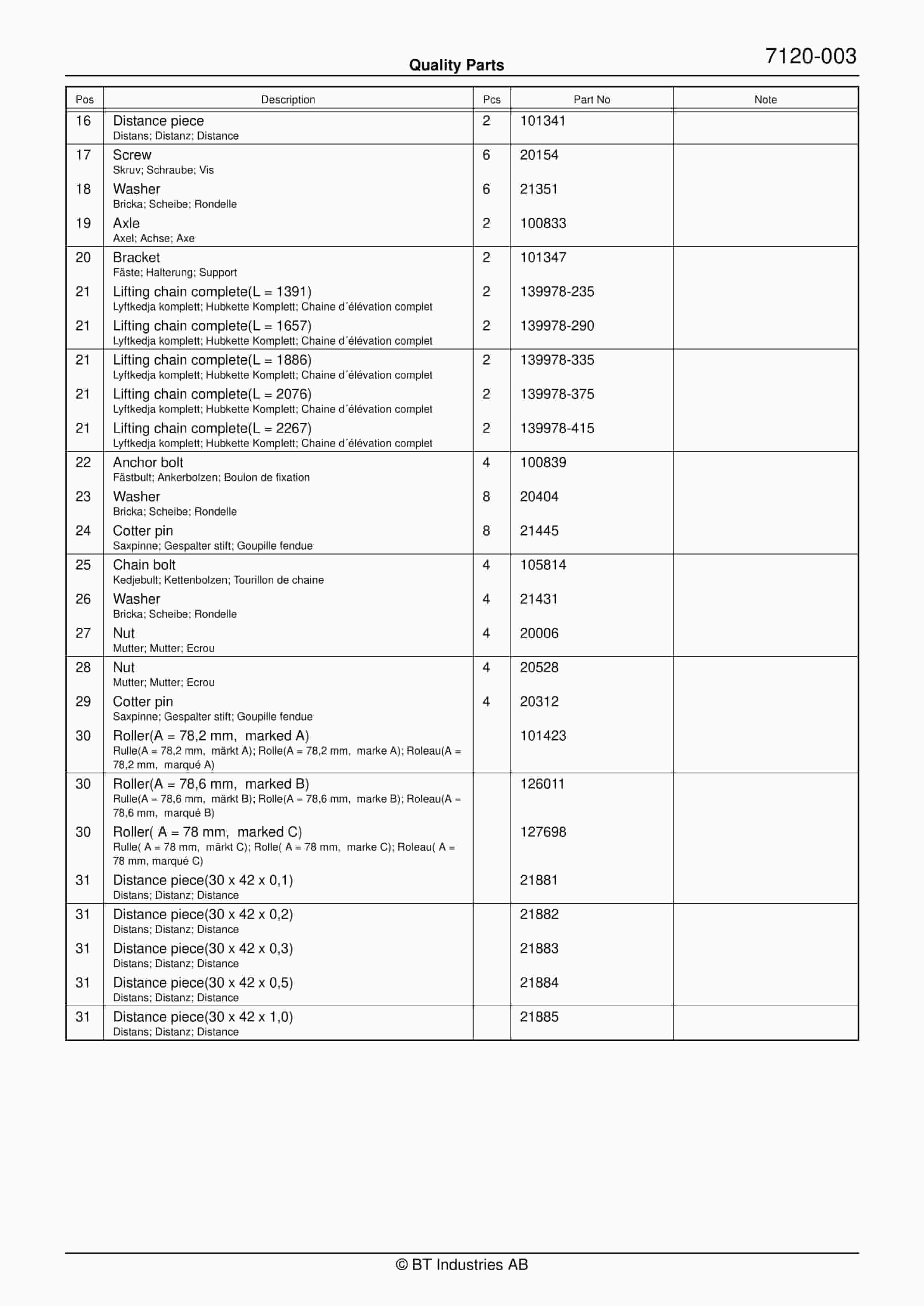 BT BTL20EW, BTL20EWO, BTL30EW, BTL30EWO, L20BR, L20BRO, L30BR, L30BRO Quality Parts 177967