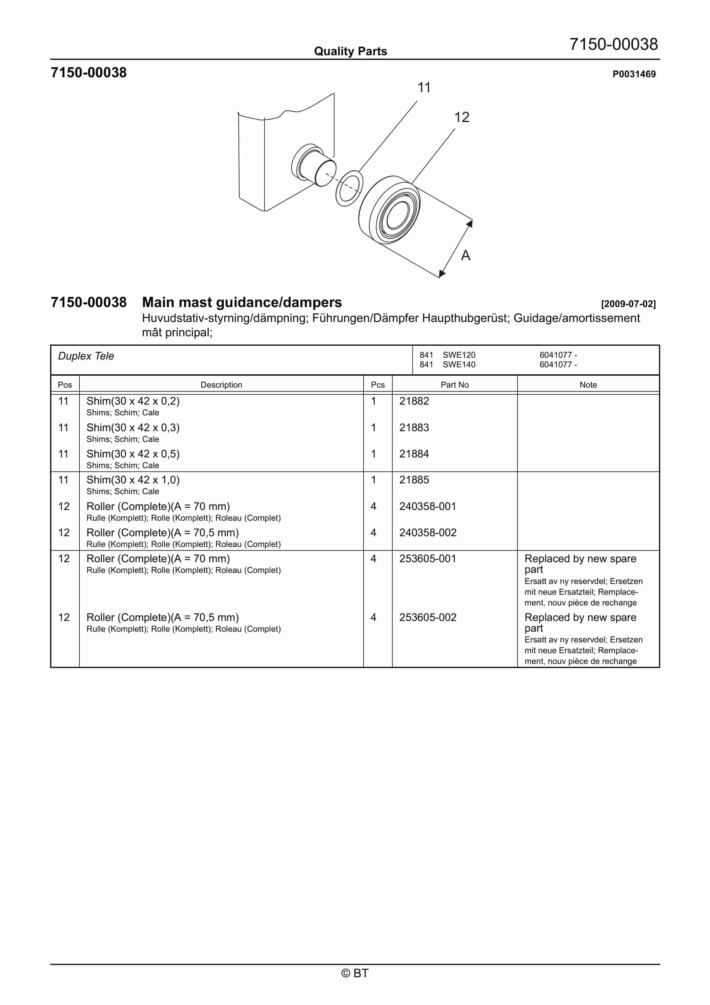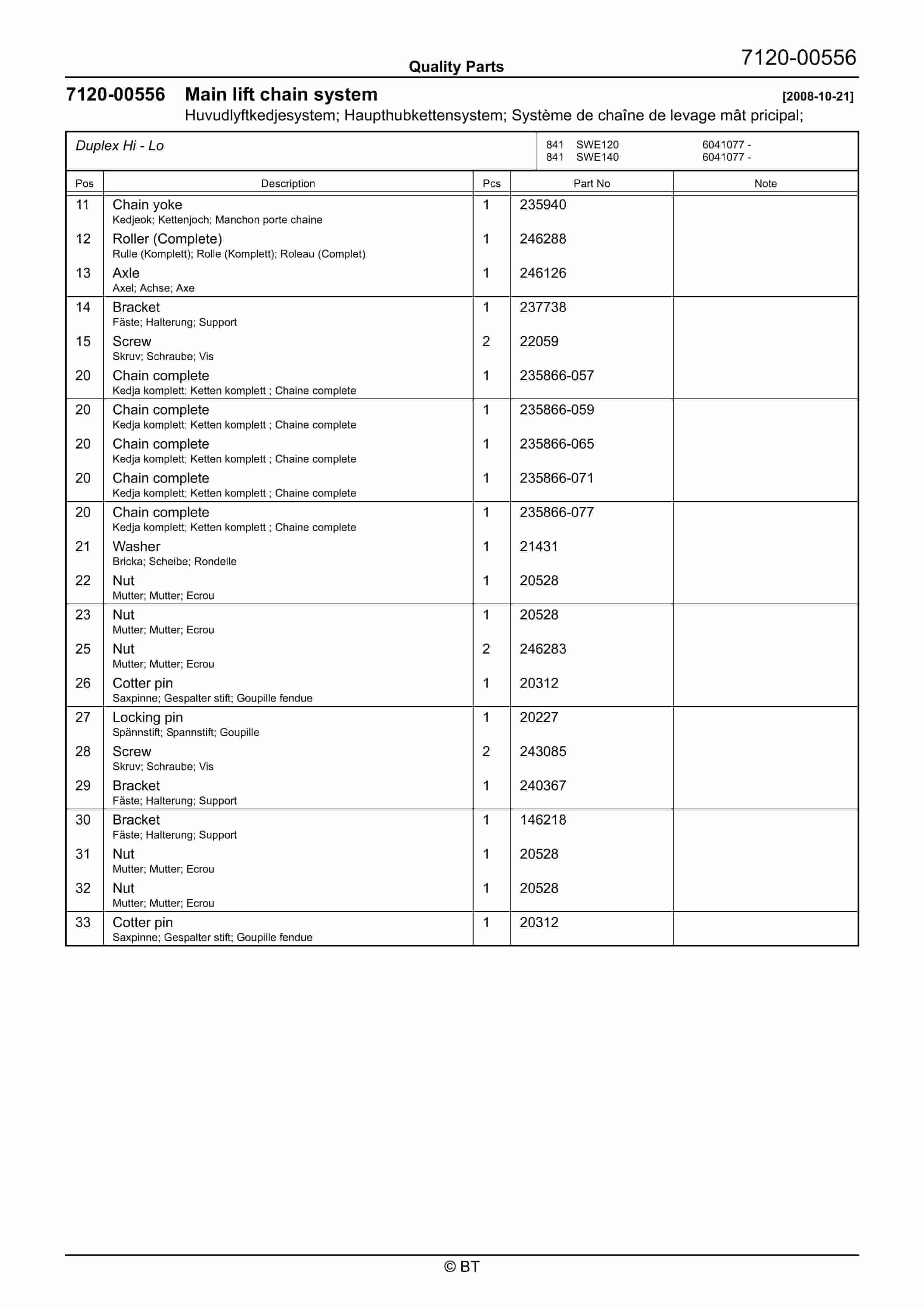 BT BTL20EW, BTL20EWO, BTL30EW, BTL30EWO, L20BR, L20BRO, L30BR, L30BRO Quality Parts 177967