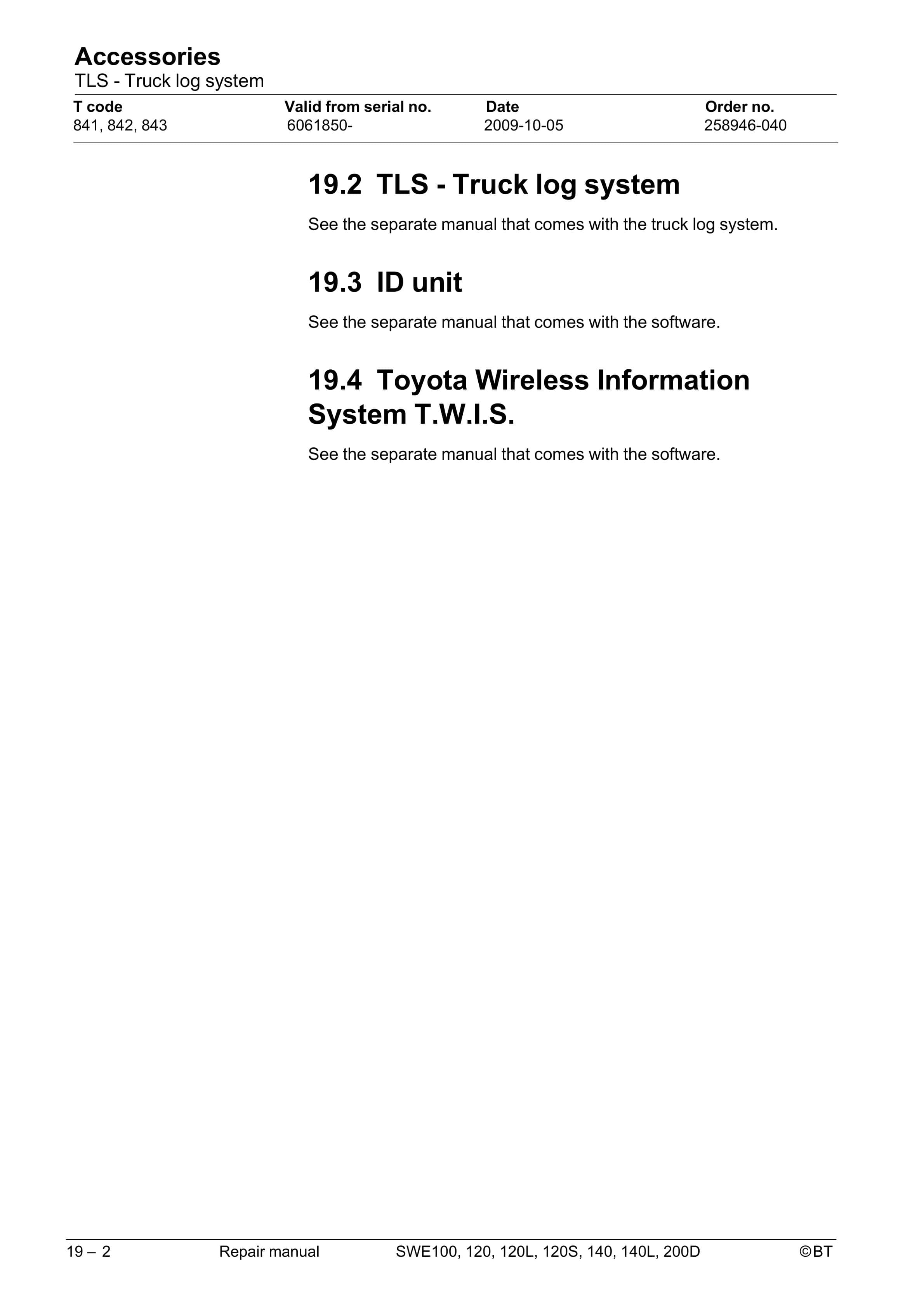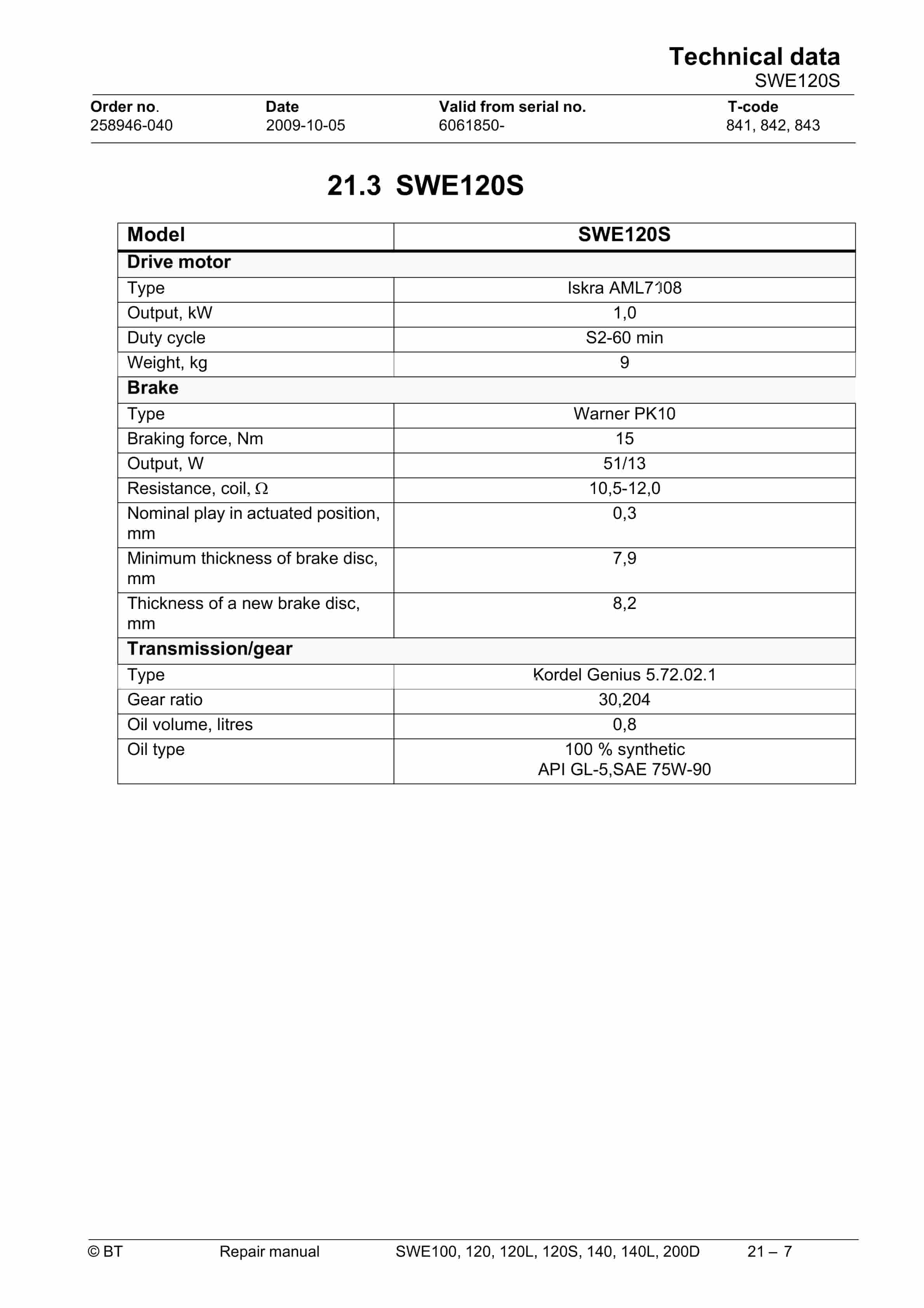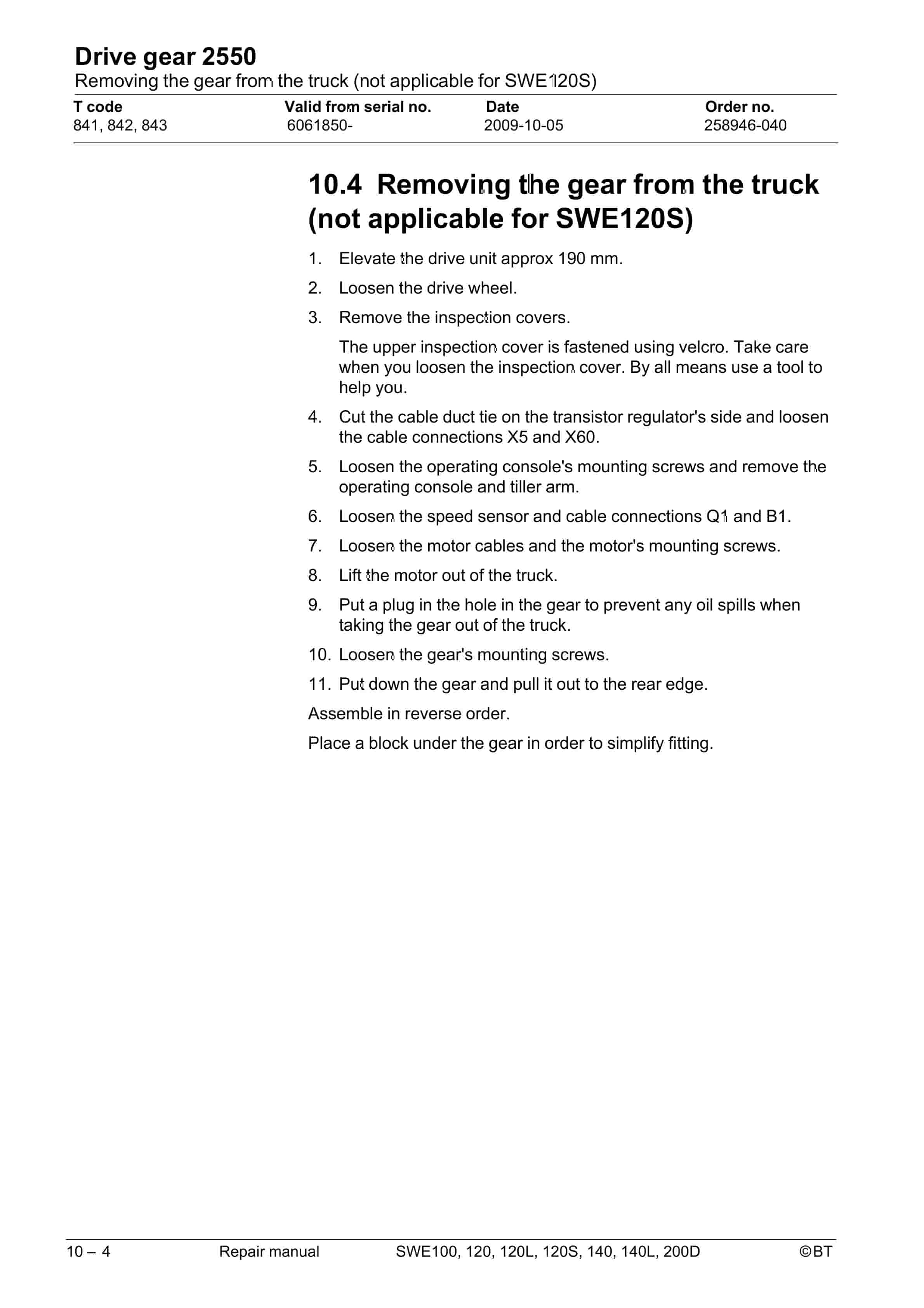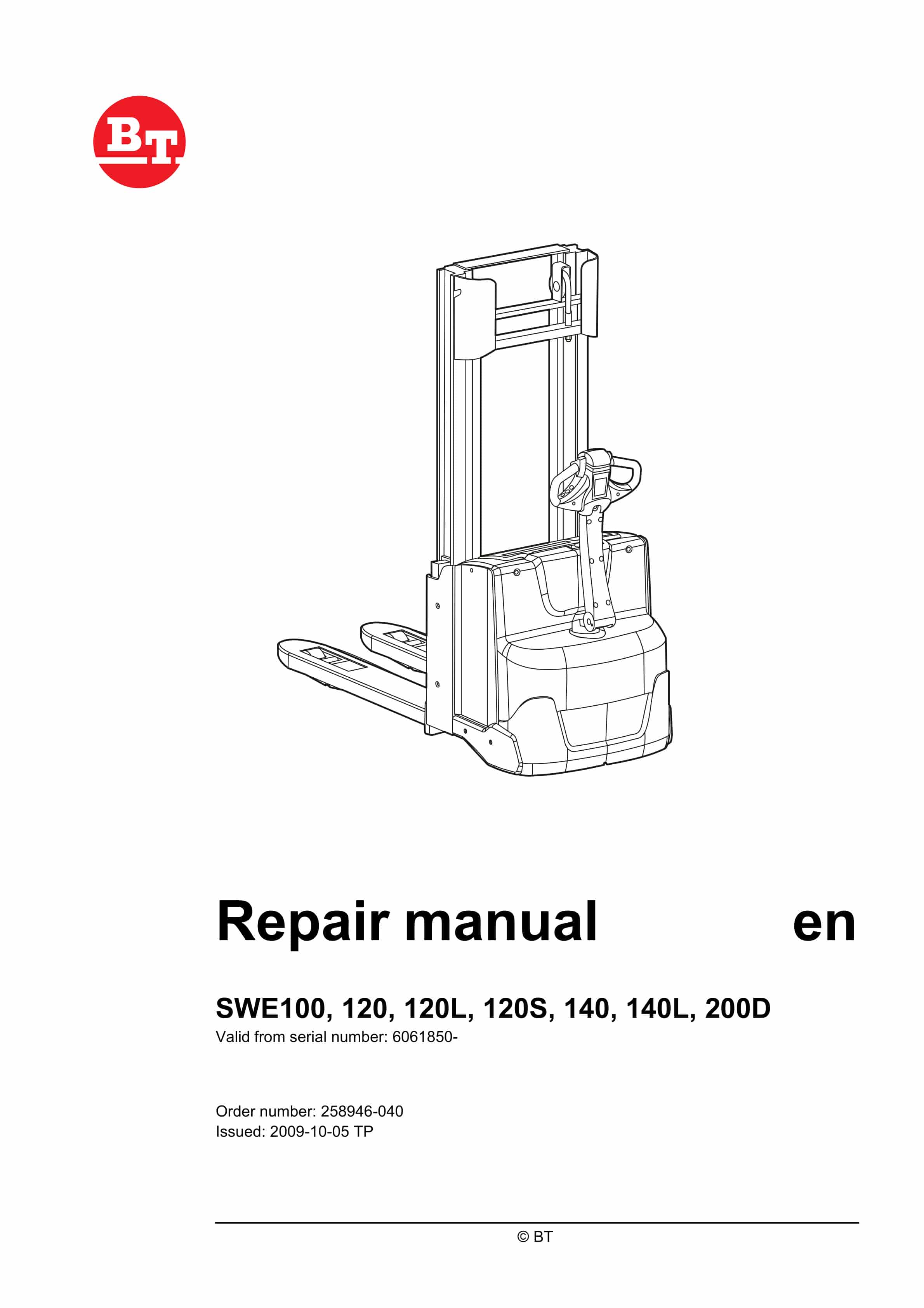 BT SWE100, SWE120, SWE120L, SWE120S, SWE140, SWE140L, SWE200D Repair Manual 258946-040