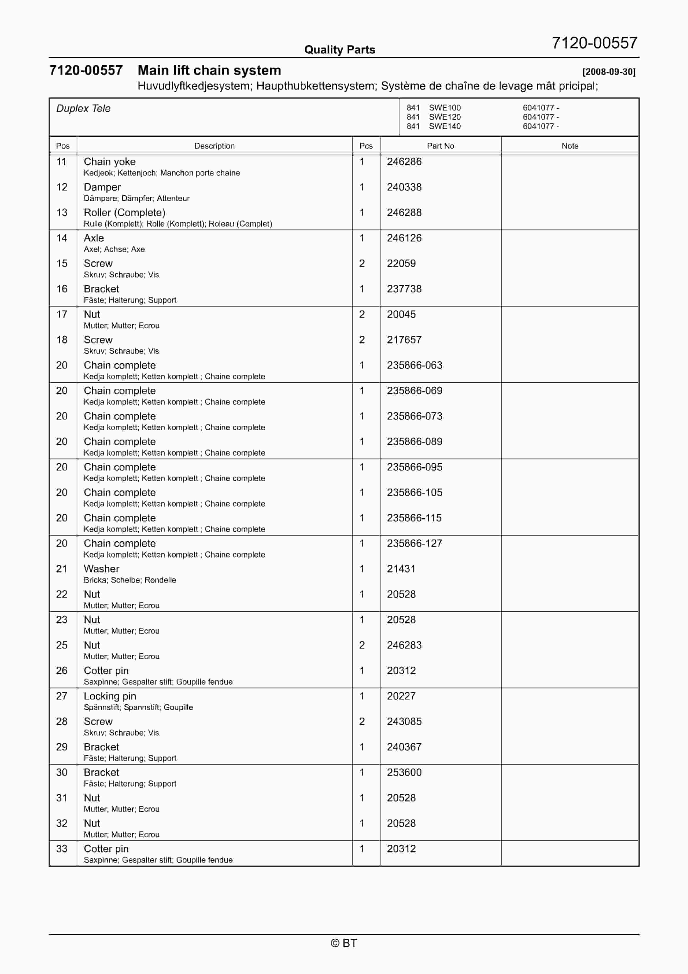 BT SWE100, SWE120, SWE140 Quality Parts 7502485