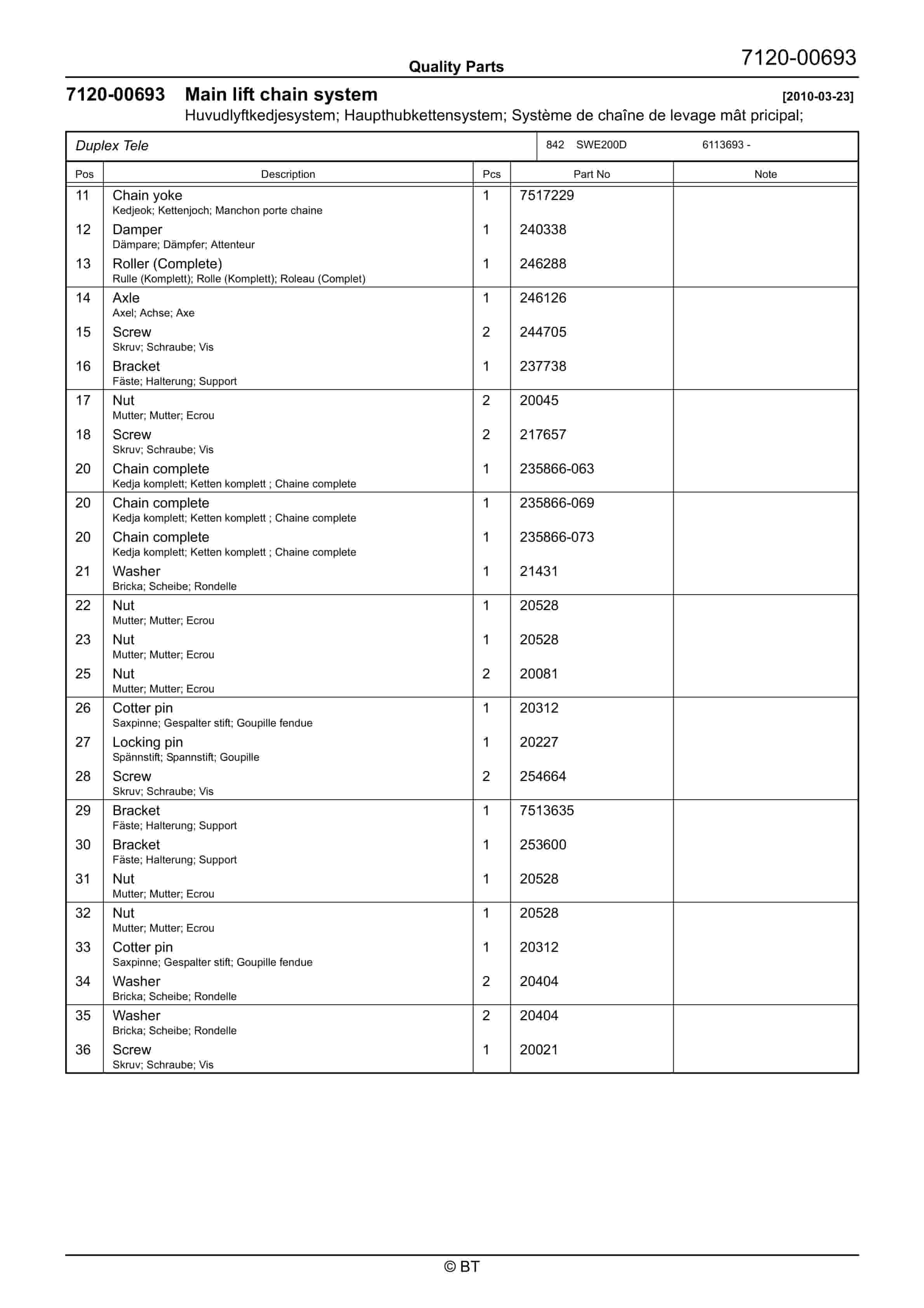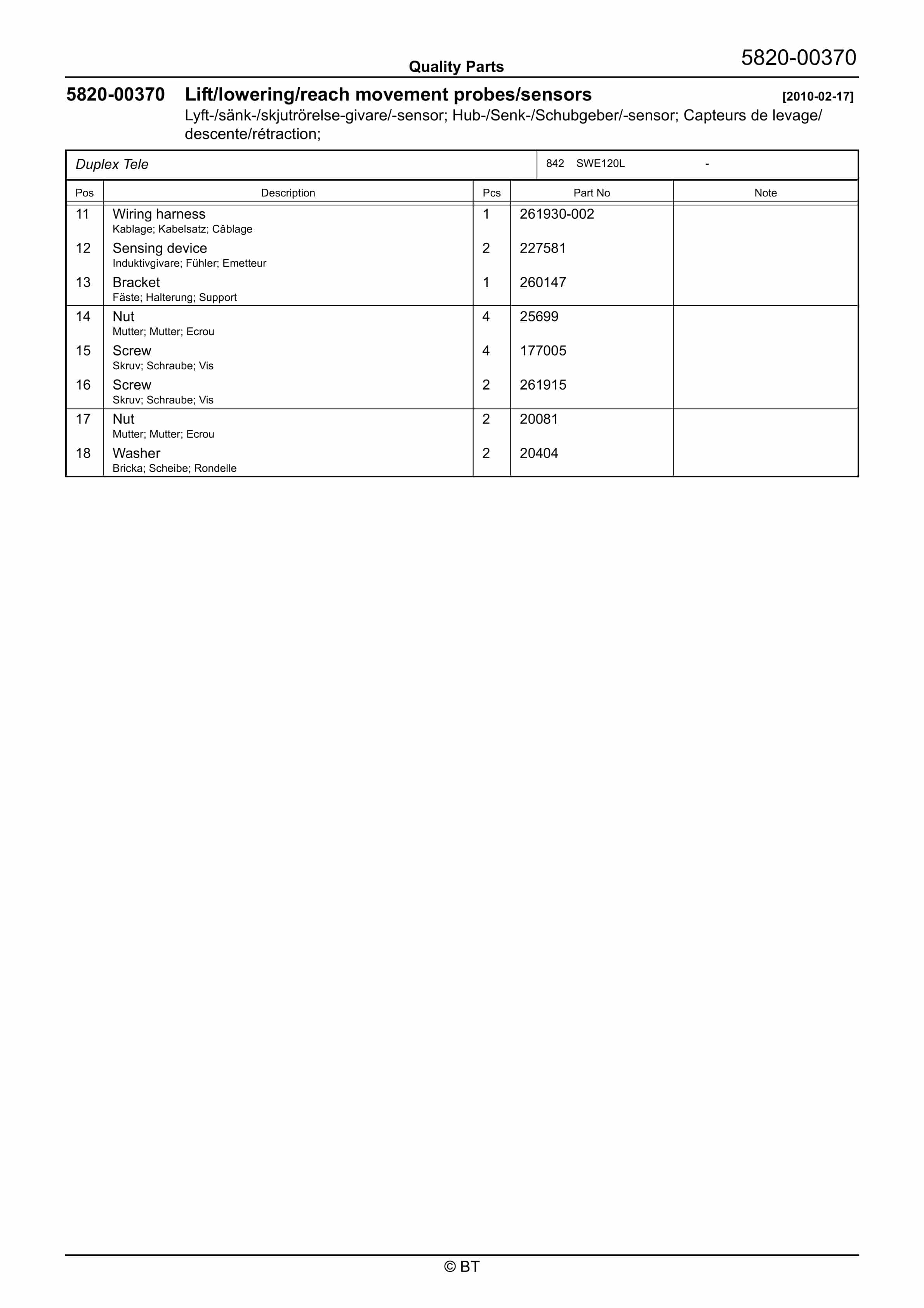 BT 602-TT, 608-TT, 609-TT, 610-TT, 612-TT, 620-TT (AC) Quality Parts 253711