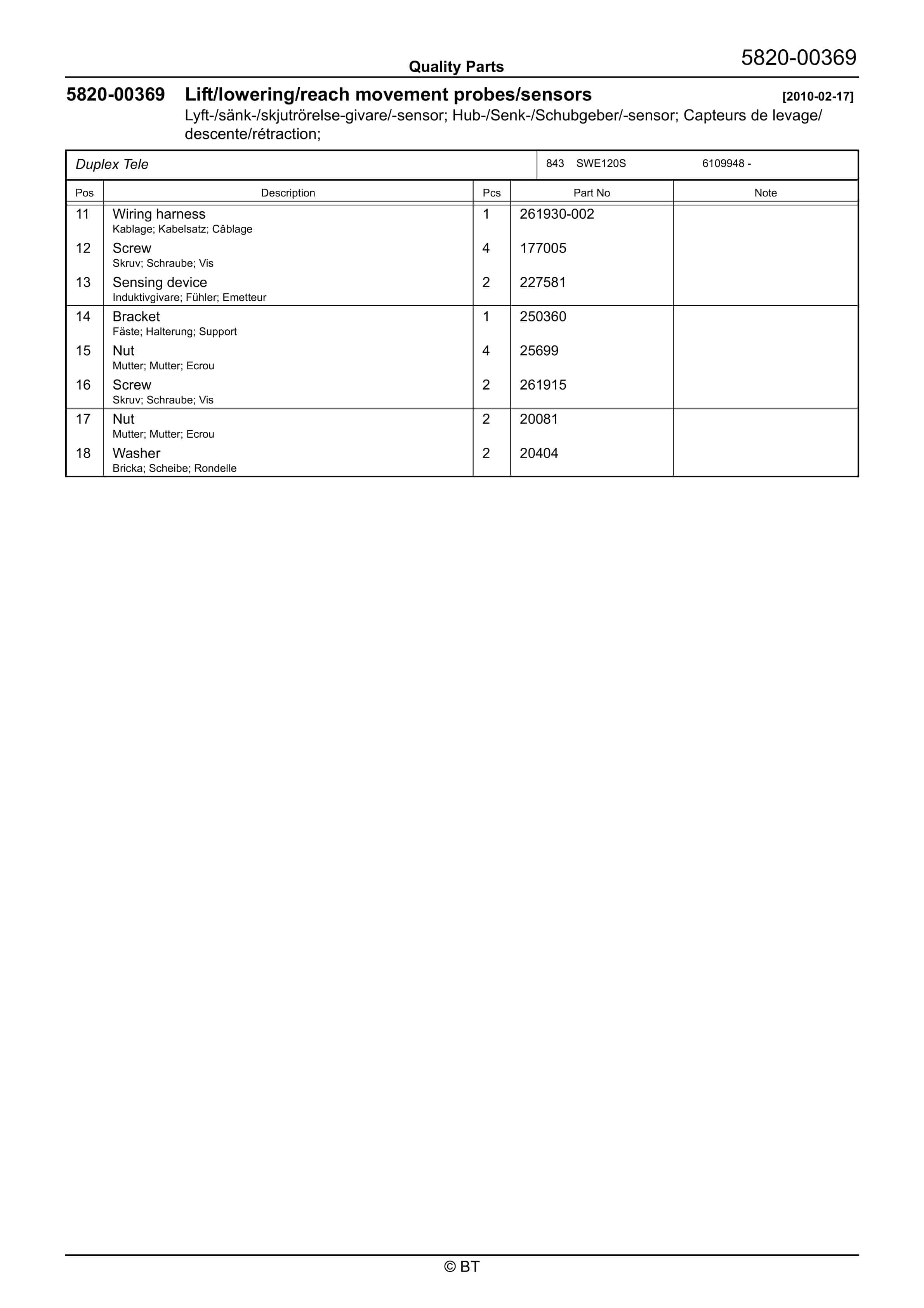 BT 602-TT, 608-TT, 609-TT, 610-TT, 612-TT, 620-TT (AC) Quality Parts 253711
