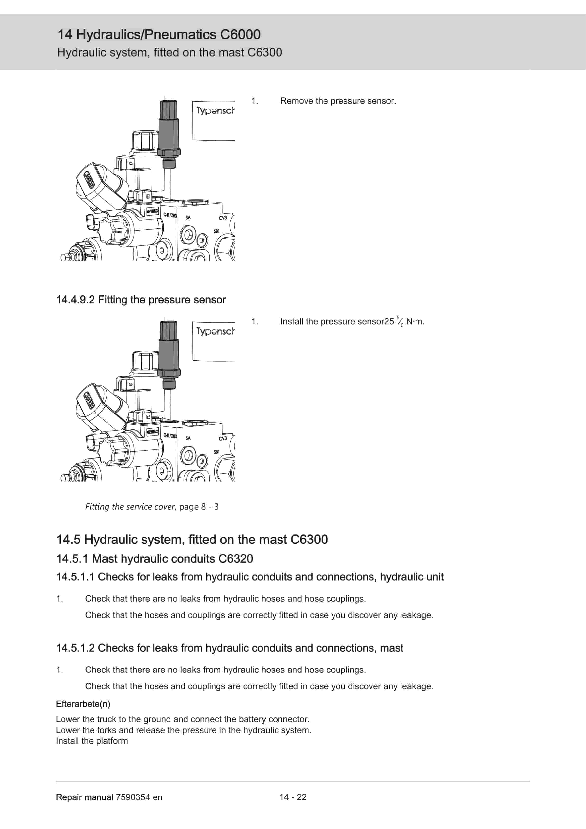- 13.5.1.2. Checks for leaks from hydraulic conduits and connections, mast