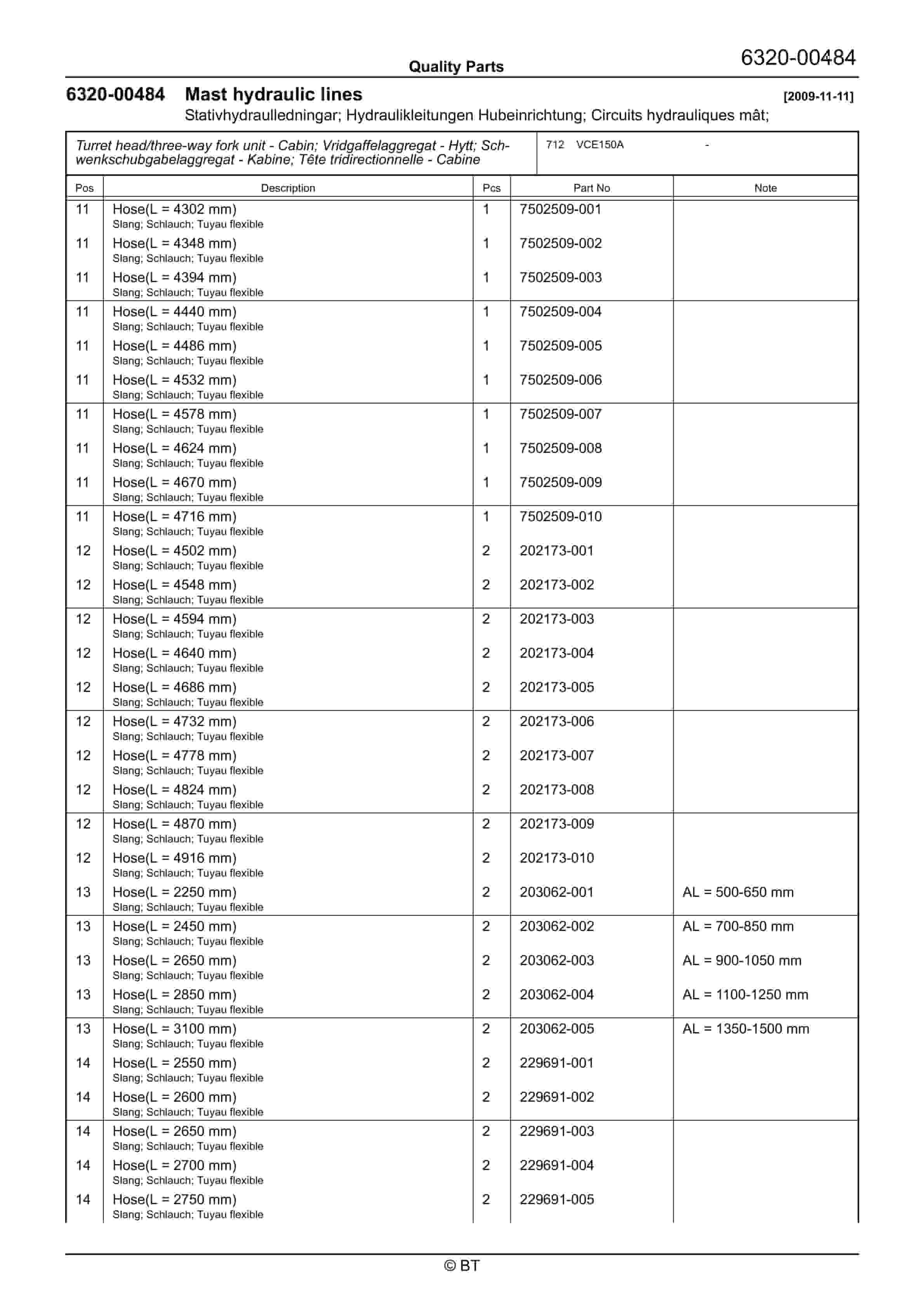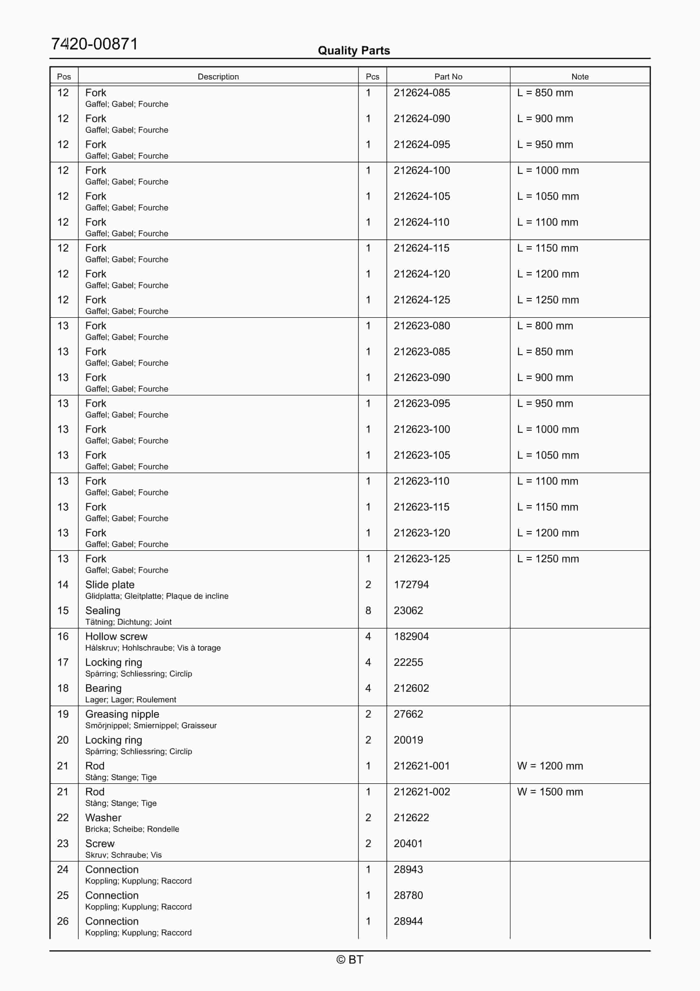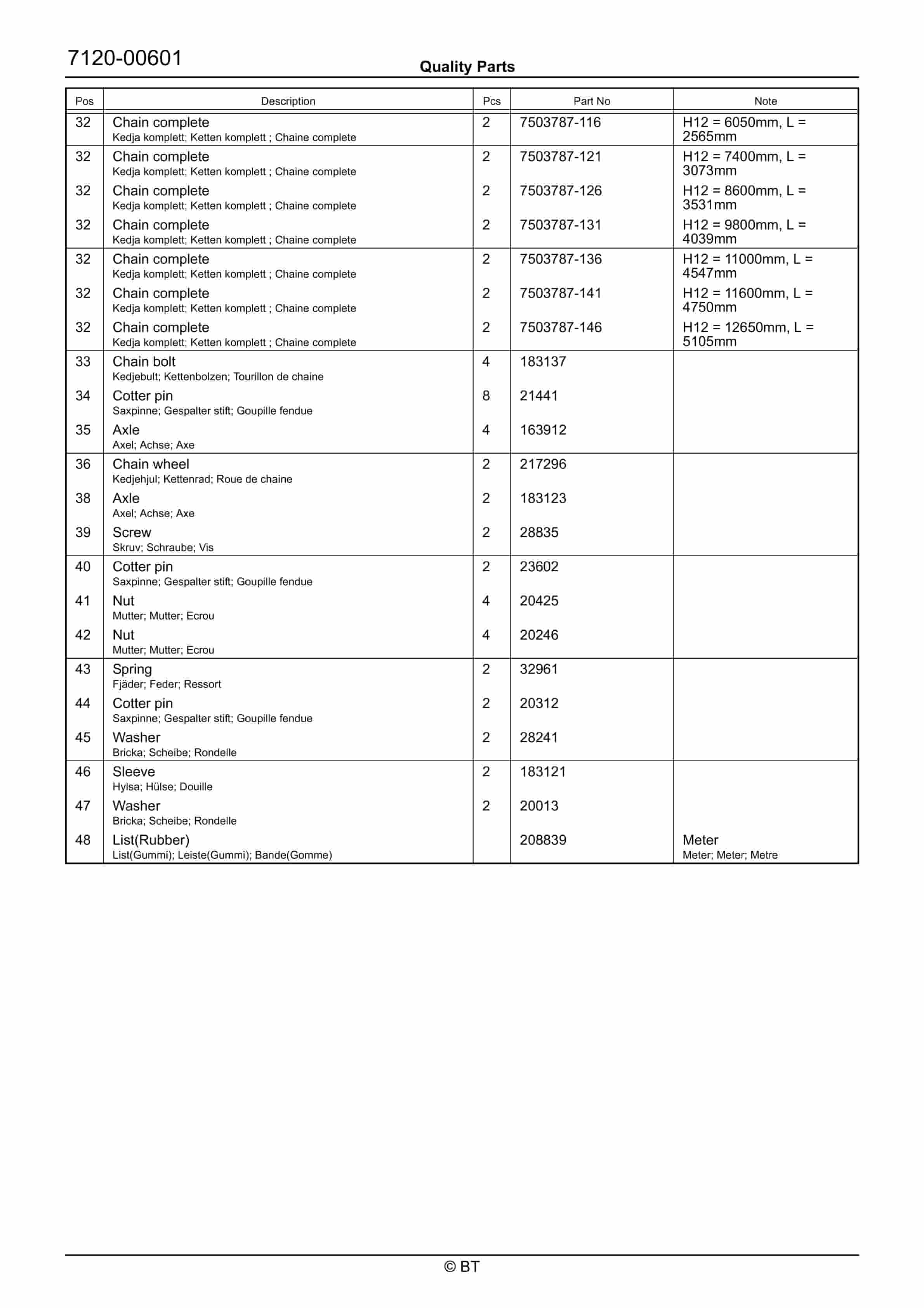 BT 602-TT, 608-TT, 609-TT, 610-TT, 612-TT, 620-TT (AC) Quality Parts 253711