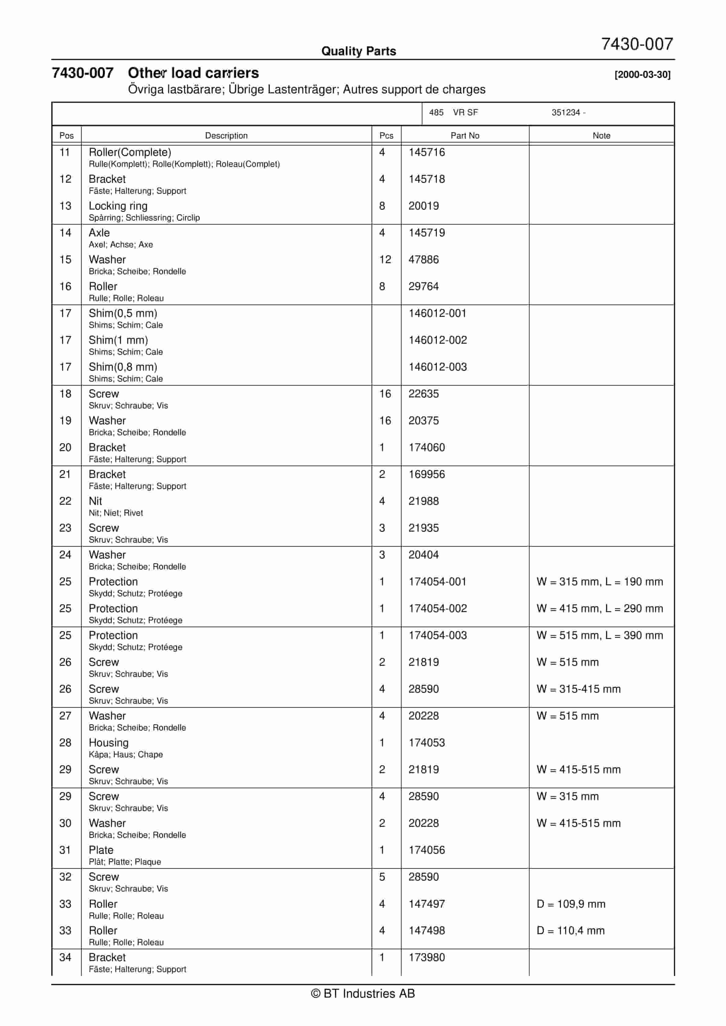 BT BTL20EW, BTL20EWO, BTL30EW, BTL30EWO, L20BR, L20BRO, L30BR, L30BRO Quality Parts 177967