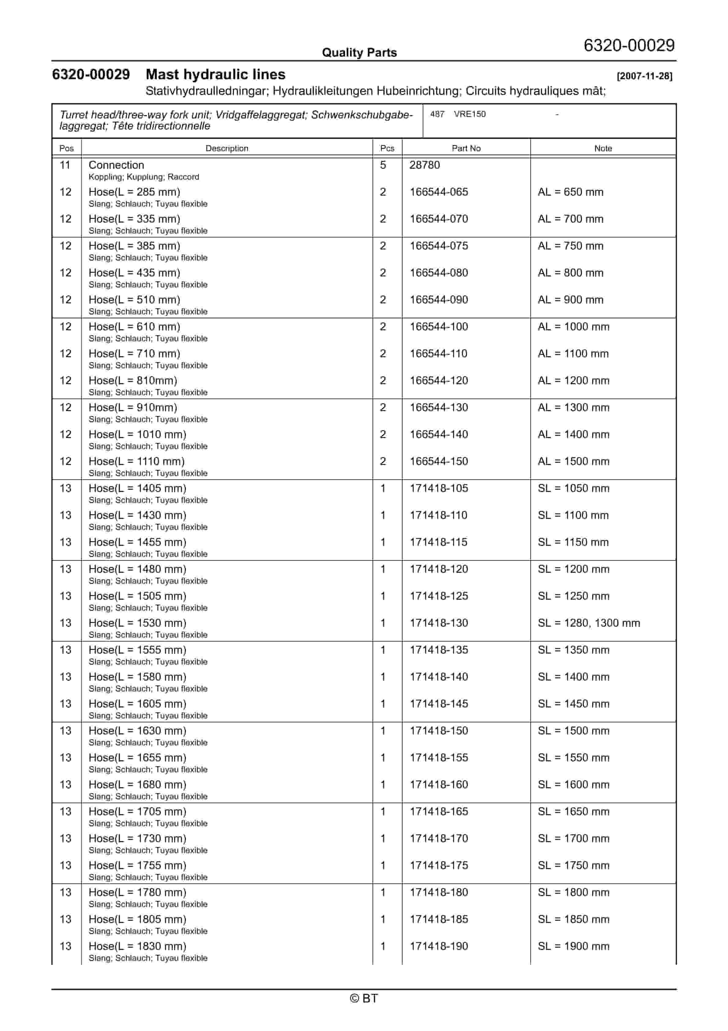 BT BTL20EW, BTL20EWO, BTL30EW, BTL30EWO, L20BR, L20BRO, L30BR, L30BRO Quality Parts 177967