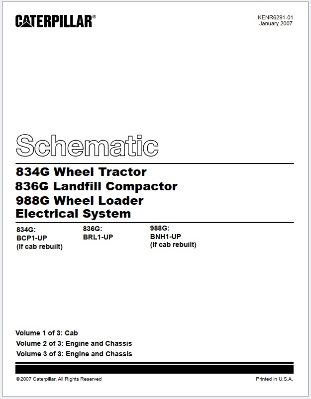 Caterpillar 834G Wheel Tractor, 836G Landfill Compactor, 988G Wheel Loader Electrical System Schematic KENR6291-01