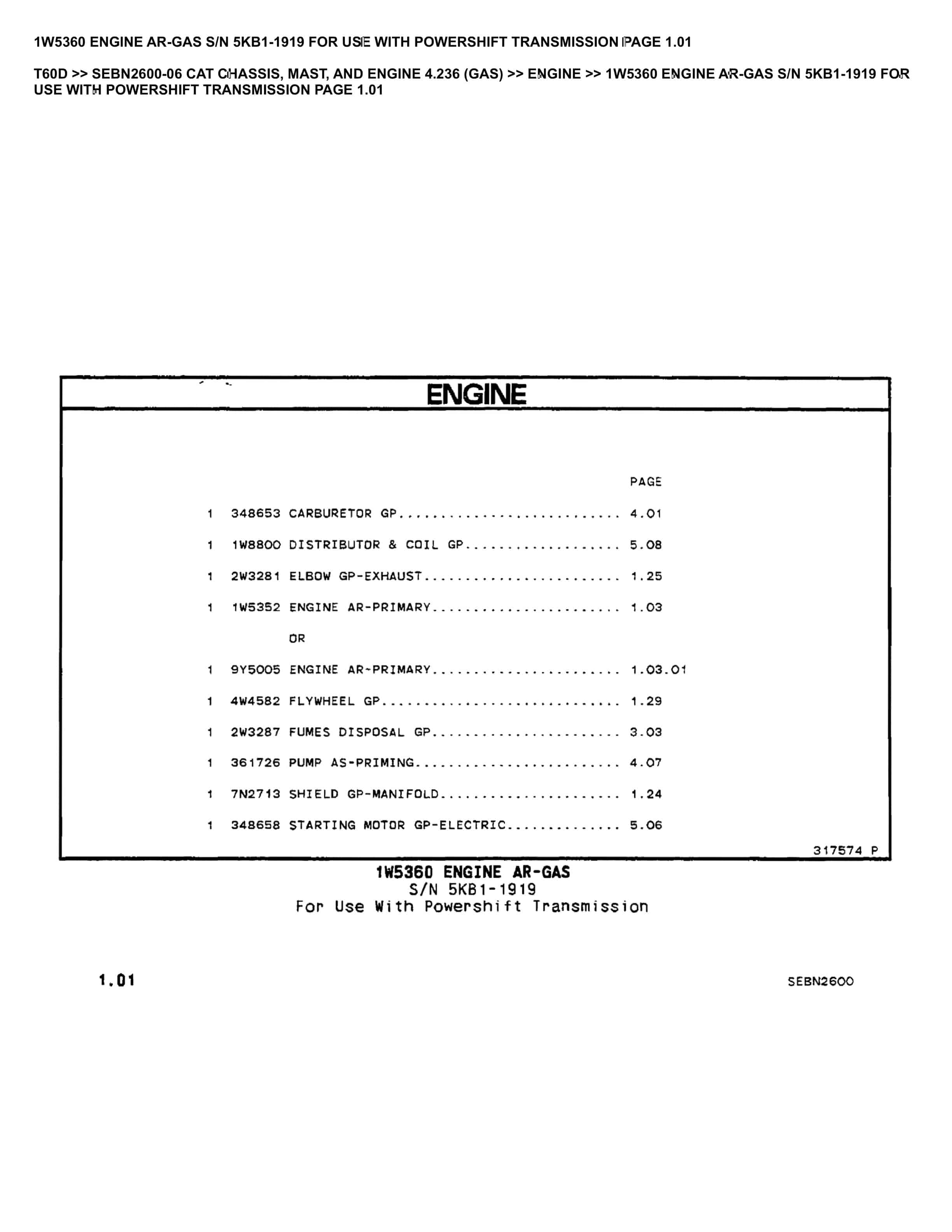 - 1. _1W5360 ENGINE AR-GAS S_N 5KB1-1919 FOR USE WITH POWERSHIFT TRANSMISSION PAGE 1.01 Spare Parts Catalog.pdf