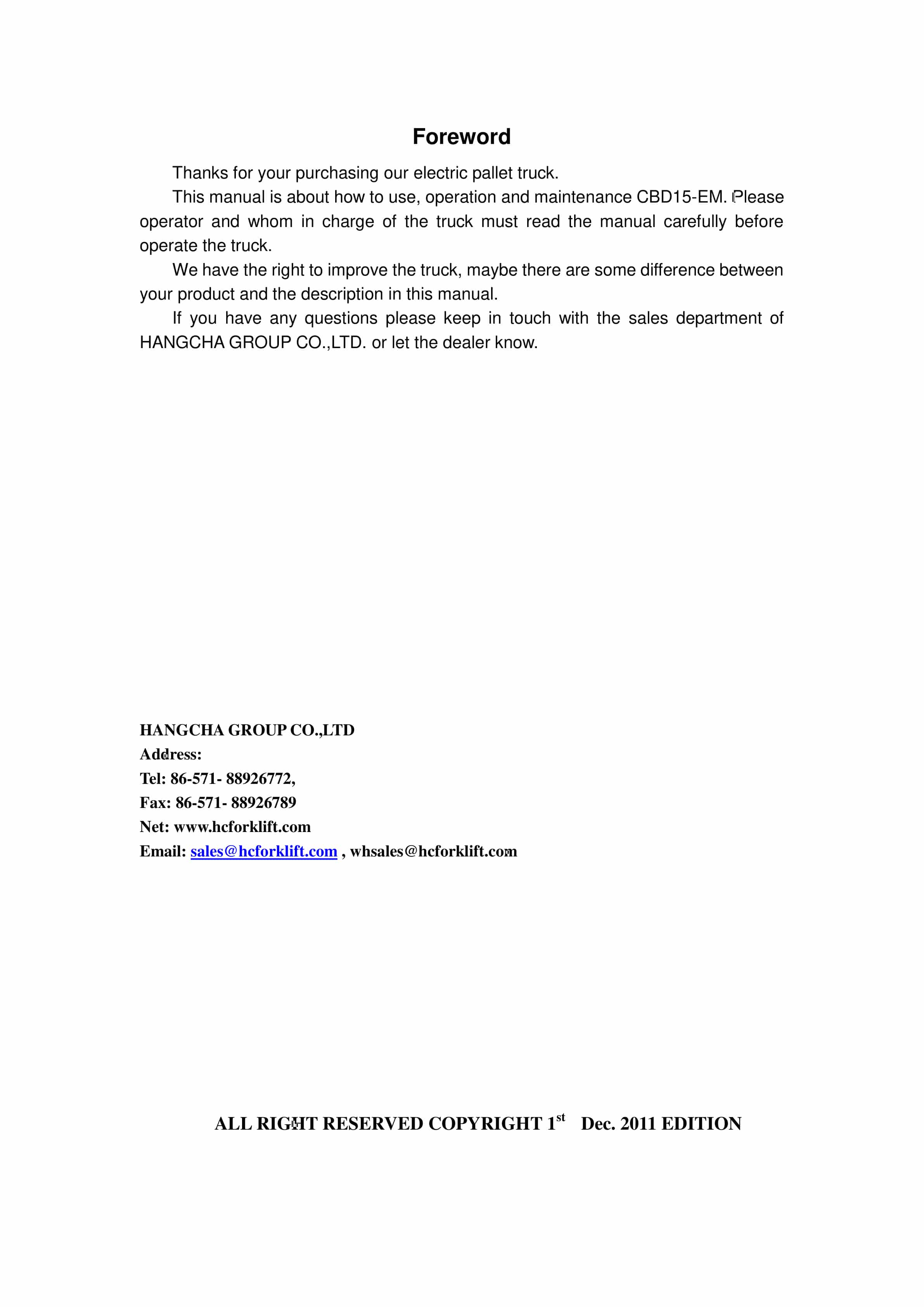 Hangcha CBD15-EM Electric Pallet Truck Operation and Maintenance Manual-3