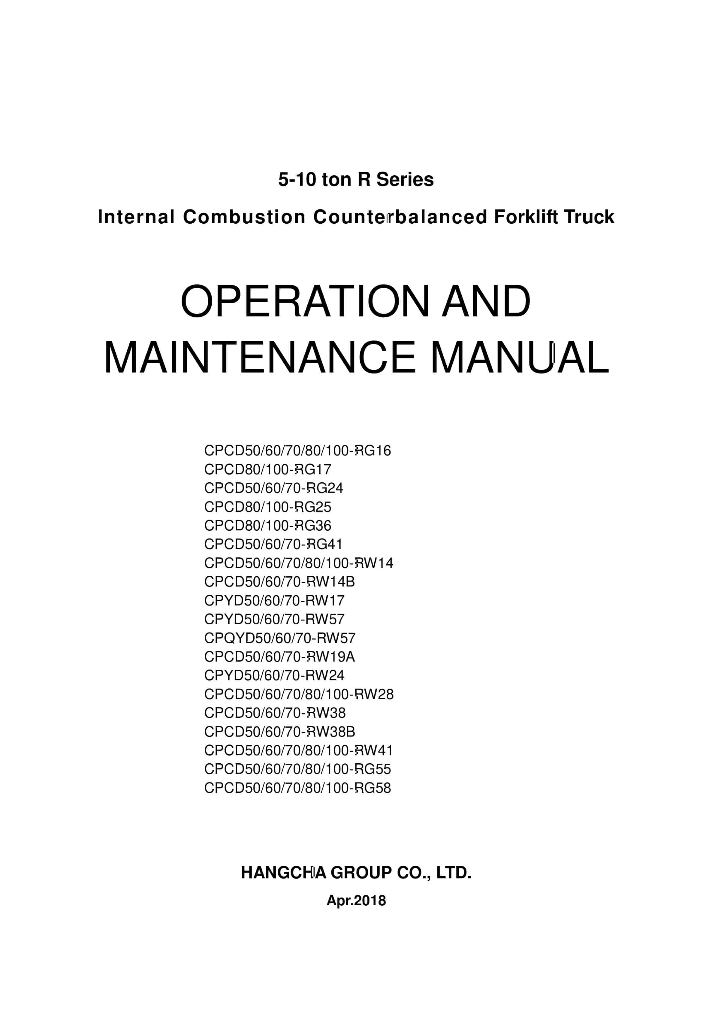 Hangcha CPCD50-RG16 to CPCD100-RG58 Operation and Maintenance Manual