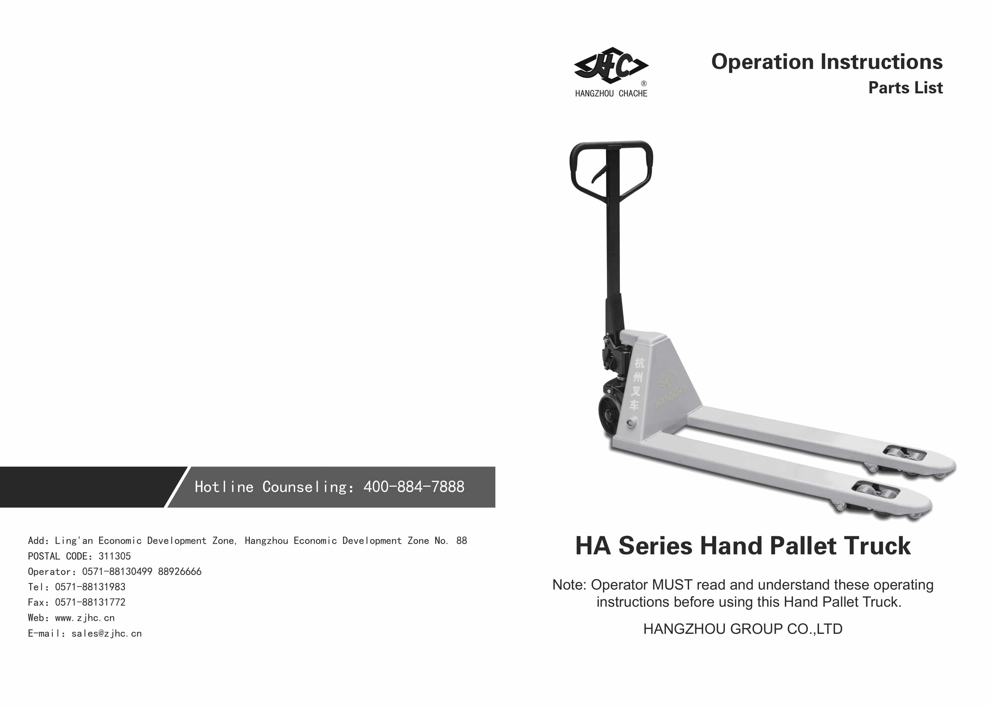 Hangcha HA Series Hand Pallet Truck Operation Instructions Parts List