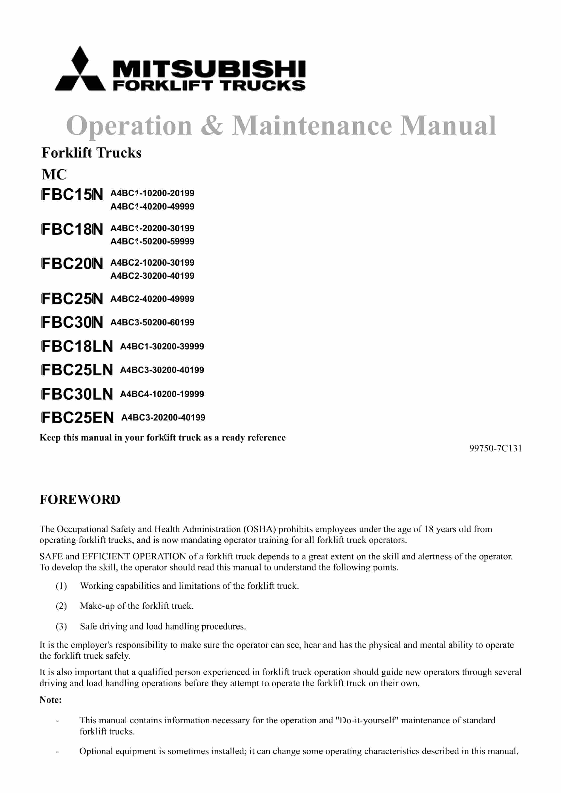 Mitsubishi FBC15N to FBC30LN Forklift Trucks Operation and Maintenance Manual 99750-7C131