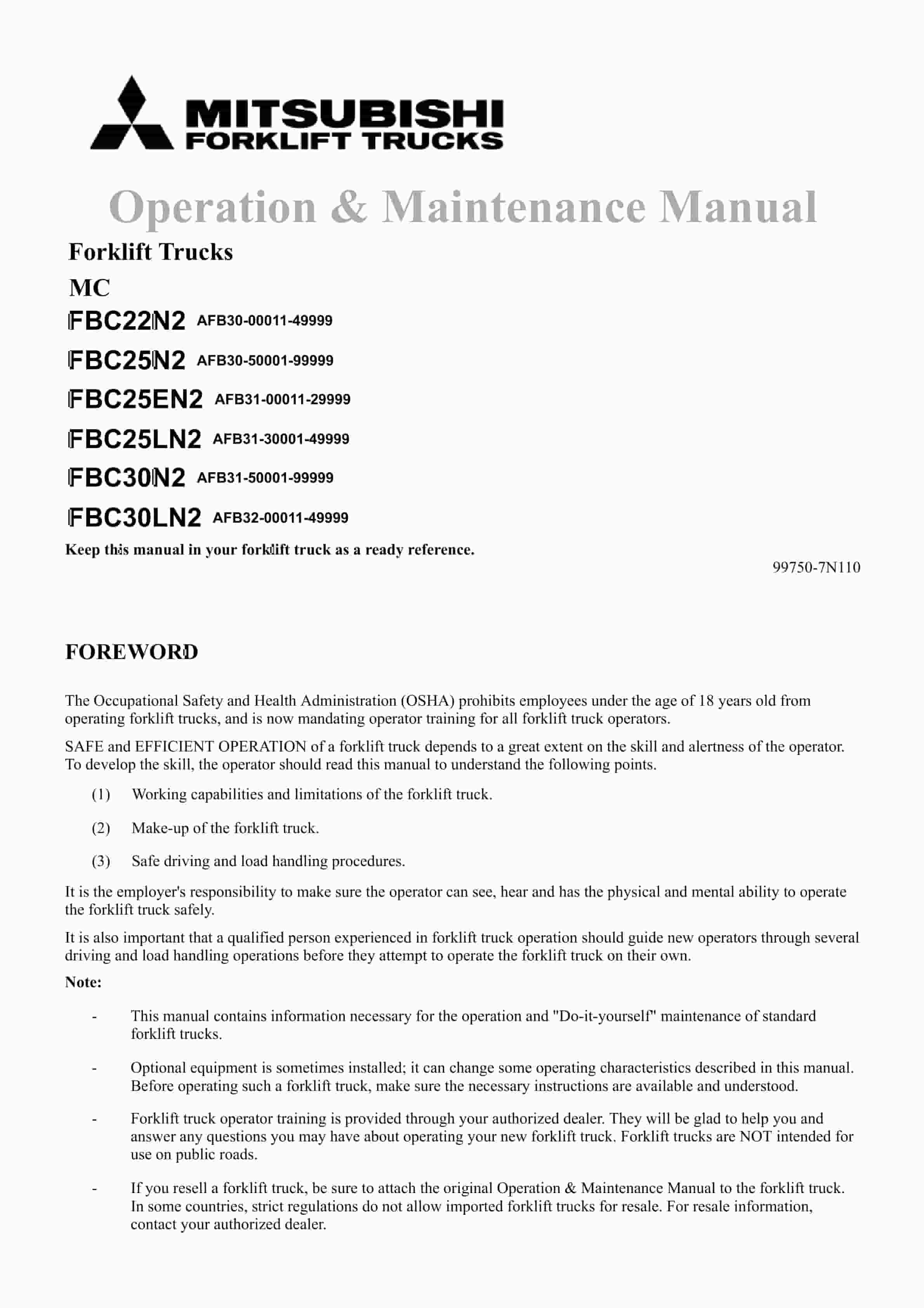 Mitsubishi FBC22N2 to FBC30LN2 Forklift Trucks Operation and Maintenance Manual 99750-7N110