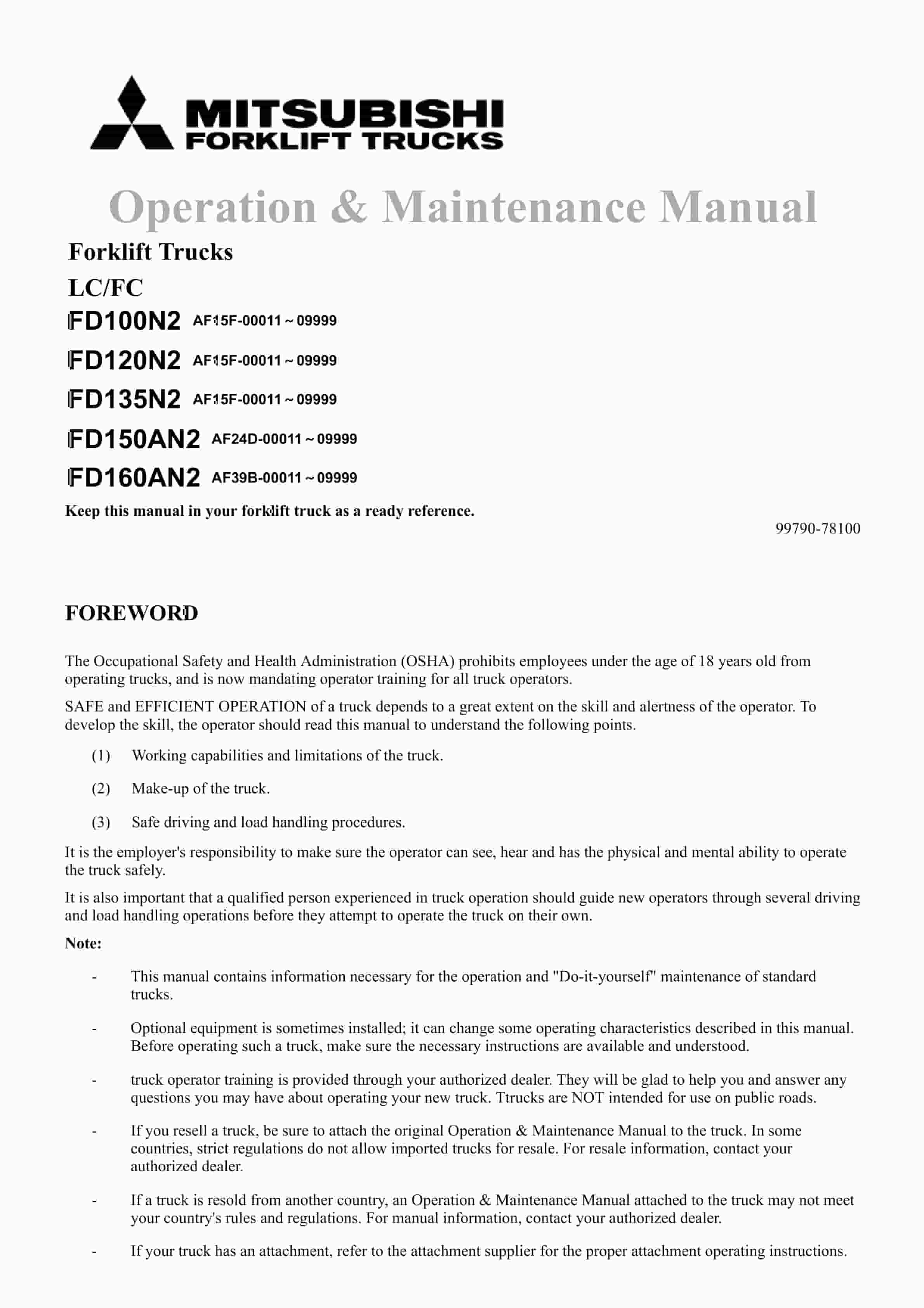 mitsubishi fd100n2 to fd160an2 forklift trucks operation and maintenance manual 99790 78100 2