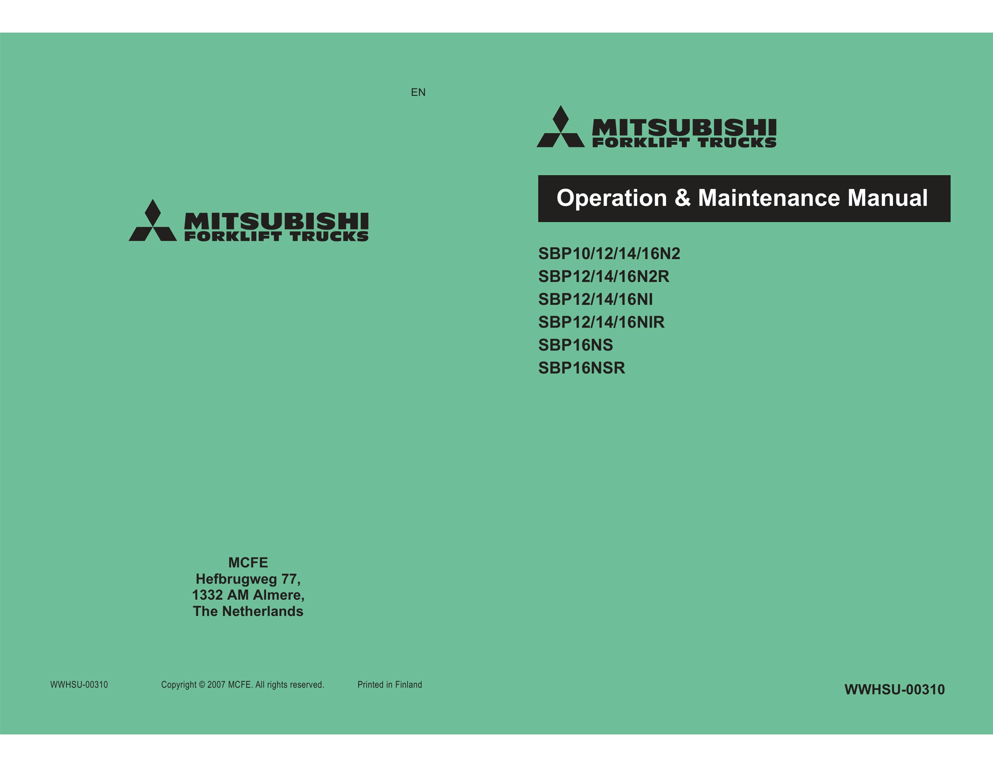 Mitsubishi SBP10-16 N2-N2R-NI-NIR, SBP16NS, SBP16NSR Operation and Maintenance Manual WWHSU-00310